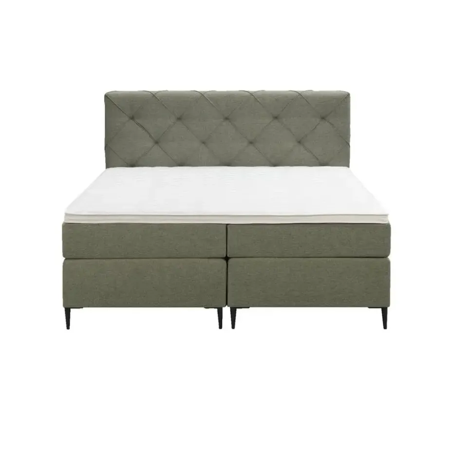 Boxspring Liv is een boxspring met een afmeting van 180×200 cm. Deze prachtige boxspring is bekleed met een fijn geweven groene stof en heeft een romantische uitstraling met een geruit hoofdbord. De Liv geruit is uitgerust met twee pocketveringmatrassen en daarnaast ook nog een koudschuim topdekmatras voor extra comfort. Het pocketveringmatras is omkeerbaar, bestaande uit zowel een medium- als een stevige kant. Hierdoor kun je zelf kiezen wat voor jou het meest comfortabel ligt.
