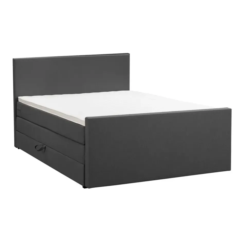 Boxspring met opbergruimte Liv is een boxspring met een afmeting van 140×200 cm. Deze prachtige boxspring is bekleed met een grof geweven antraciete stof en heeft een strakke uitstraling met een egaal hoofd- en voetbord. De Liv egaal is uitgerust met een pocketveringmatras en daarnaast ook nog een koudschuim topdekmatras voor extra comfort. Het pocketveringmatras is omkeerbaar, bestaande uit zowel een medium- als een stevige kant. Hierdoor kun je zelf kiezen wat voor jou het meest comfortabel ligt.