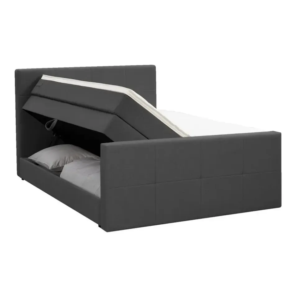 Boxspring met opbergruimte Liv is een boxspring met een afmeting van 180×200 cm. Deze prachtige boxspring is bekleed met een grof geweven antraciete stof en heeft een landelijke uitstraling met een geblokt hoofd- en voetbord. De Liv geblokt is uitgerust met twee pocketveringmatrassen en daarnaast ook nog een koudschuim topdekmatras voor extra comfort. Het pocketveringmatras is omkeerbaar, bestaande uit zowel een medium- als een stevige kant. Hierdoor kun je zelf kiezen wat voor jou het meest comfortabel ligt.