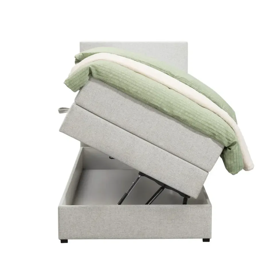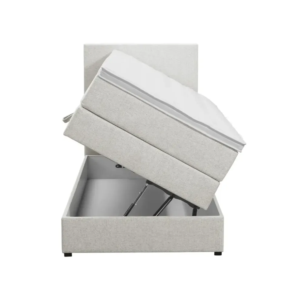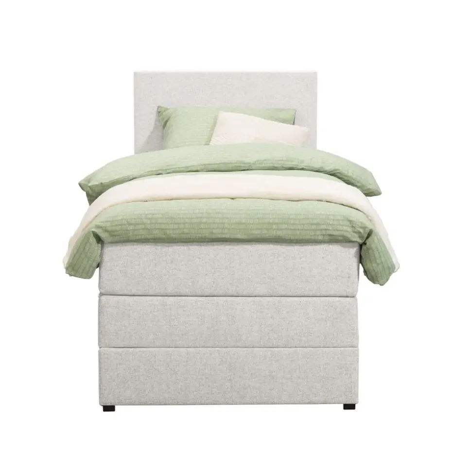 Boxspring met opbergruimte Liv is een boxspring met een afmeting van 90×200 cm. Deze prachtige boxspring is bekleed met een fijn geweven ecru stof en heeft een strakke uitstraling met een egaal hoofdbord. De Liv egaal is uitgerust met een pocketveringmatras en daarnaast ook nog een koudschuim topdekmatras voor extra comfort. Het pocketveringmatras is omkeerbaar, bestaande uit zowel een medium- als een stevige kant. Hierdoor kun je zelf kiezen wat voor jou het meest comfortabel ligt.