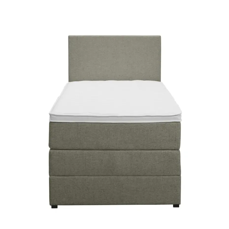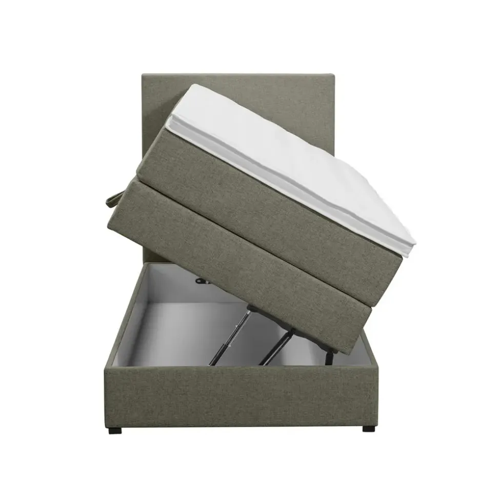 Boxspring met opbergruimte Liv is een boxspring met een afmeting van 90×200 cm. Deze prachtige boxspring is bekleed met een fijn geweven groene stof en heeft een strakke uitstraling met een egaal hoofdbord. De Liv egaal is uitgerust met een pocketveringmatras en daarnaast ook nog een koudschuim topdekmatras voor extra comfort. Het pocketveringmatras is omkeerbaar, bestaande uit zowel een medium- als een stevige kant. Hierdoor kun je zelf kiezen wat voor jou het meest comfortabel ligt.