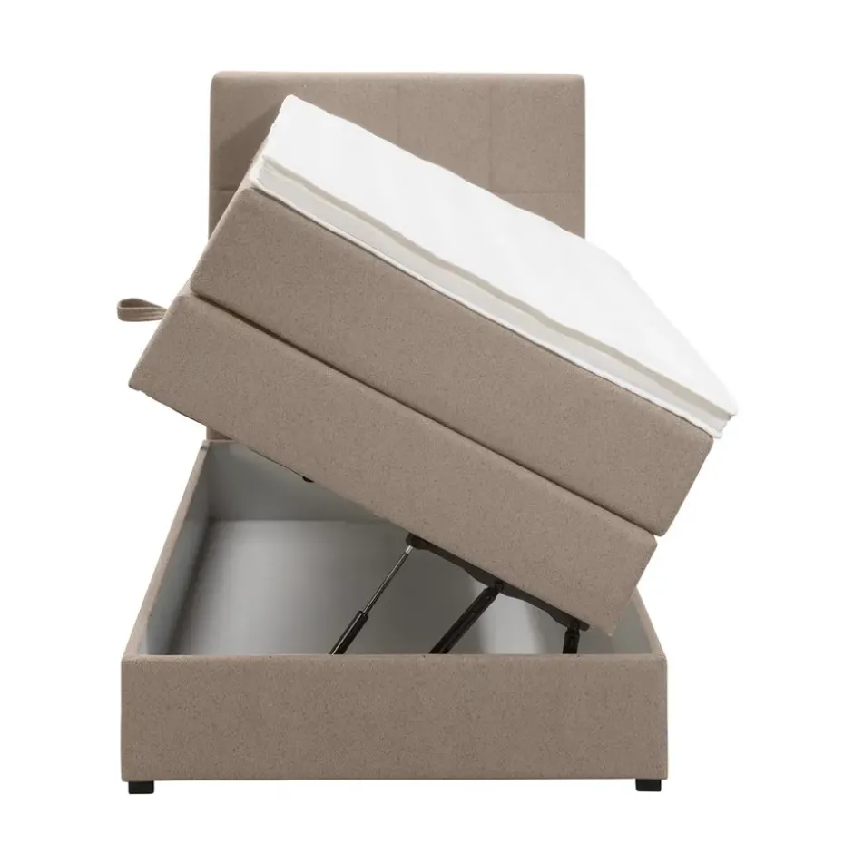 Boxspring met opbergruimte Liv is een boxspring met een afmeting van 90×200 cm. Deze prachtige boxspring is bekleed met een grof geweven beige stof en heeft een landelijke uitstraling met een geblokt hoofdbord. De Liv geblokt is uitgerust met een pocketveringmatras en daarnaast ook nog een koudschuim topdekmatras voor extra comfort. Het pocketveringmatras is omkeerbaar, bestaande uit zowel een medium- als een stevige kant. Hierdoor kun je zelf kiezen wat voor jou het meest comfortabel ligt.