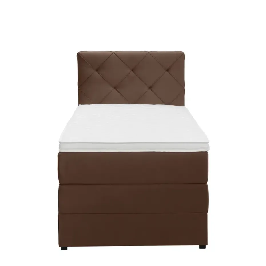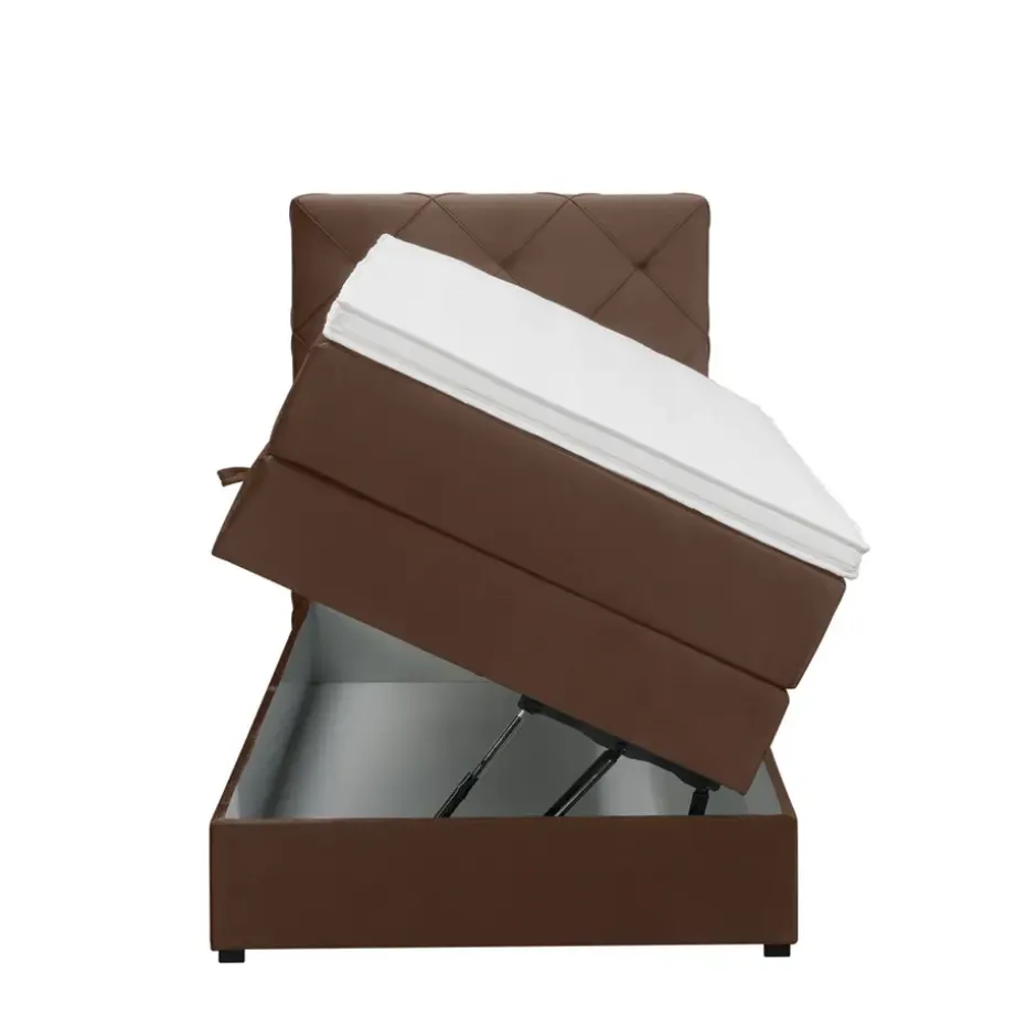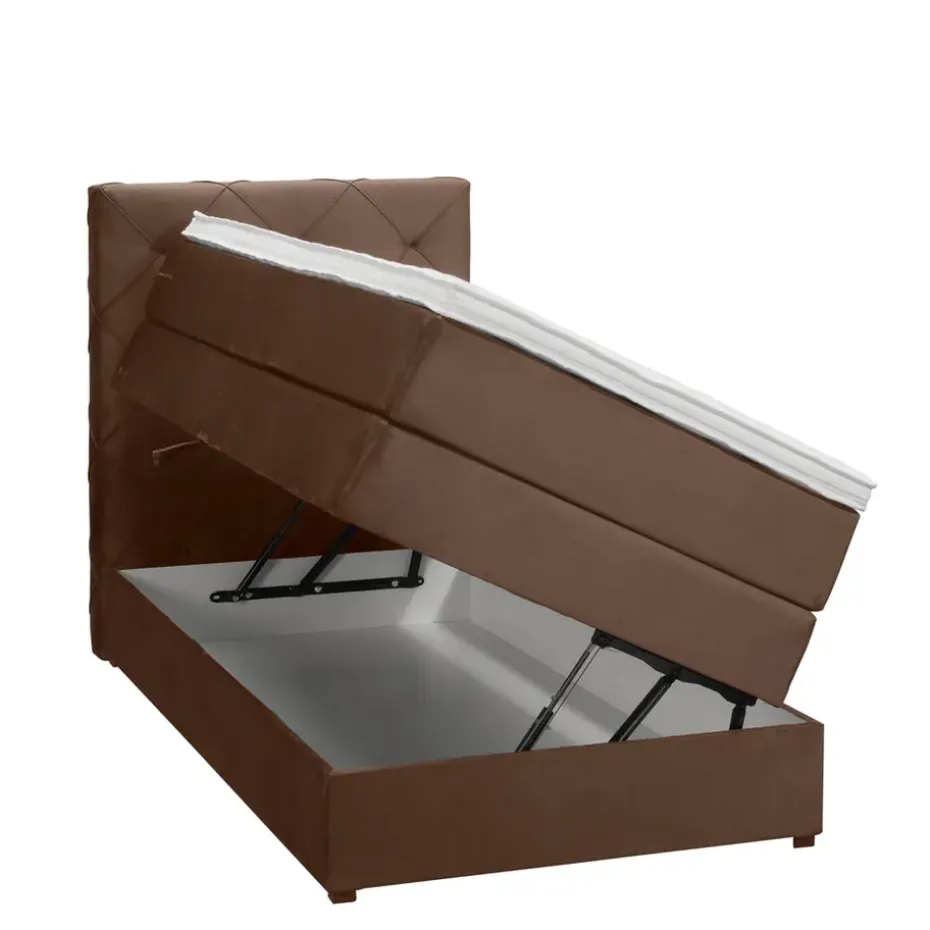Boxspring met opbergruimte Liv is een boxspring met een afmeting van 90×200 cm. Deze prachtige boxspring is bekleed met een velvet bruine stof en heeft een romantische uitstraling met een geruit hoofdbord. De Liv geruit is uitgerust met pocketveringmatrassen en daarnaast ook nog een koudschuim topdekmatras voor extra comfort. Het pocketveringmatras is omkeerbaar, bestaande uit zowel een medium- als een stevige kant. Hierdoor kun je zelf kiezen wat voor jou het meest comfortabel ligt.