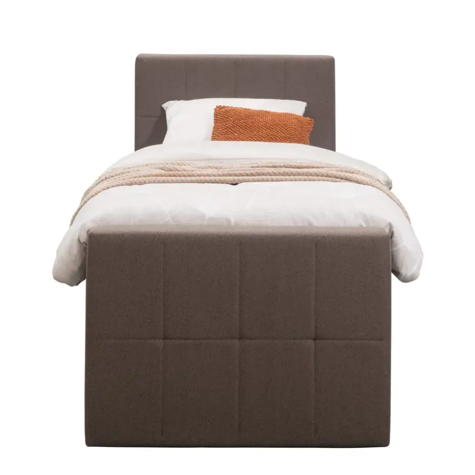 Boxspring Liv is een boxspring met een afmeting van 90×200 cm. Deze prachtige boxspring is bekleed met een grof geweven donkerbruine stof en heeft een landelijke uitstraling met een geblokt hoofd- en voetbord. De Liv geblokt is uitgerust met een pocketveringmatras en daarnaast ook nog een koudschuim topdekmatras voor extra comfort. Het pocketveringmatras is omkeerbaar, bestaande uit zowel een medium- als een stevige kant. Hierdoor kun je zelf kiezen wat voor jou het meest comfortabel ligt.
