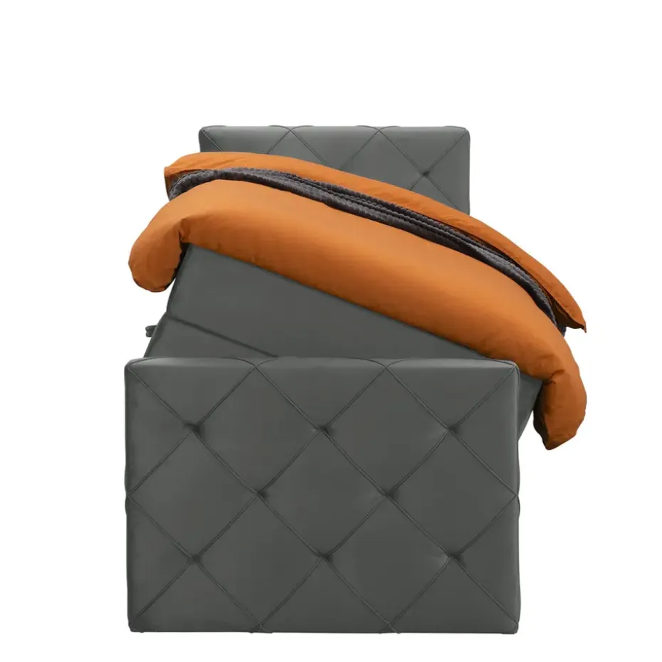 Boxspring Liv is een boxspring met een afmeting van 90×200 cm. Deze prachtige boxspring is bekleed met een velvet grijze stof en heeft een romantische uitstraling met een geruit hoofd- en voetbord. De Liv geruit is uitgerust met een pocketveringmatras en daarnaast ook nog een koudschuim topdekmatras voor extra comfort. Het pocketveringmatras is omkeerbaar, bestaande uit zowel een medium- als een stevige kant. Hierdoor kun je zelf kiezen wat voor jou het meest comfortabel ligt.