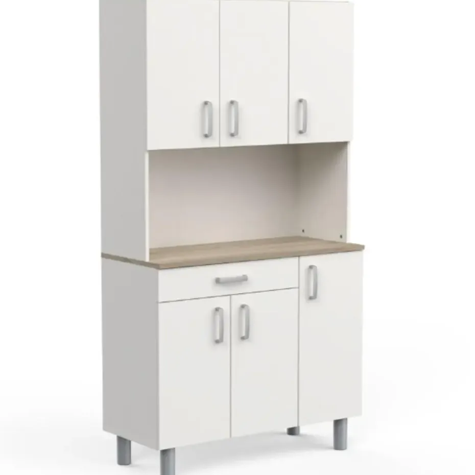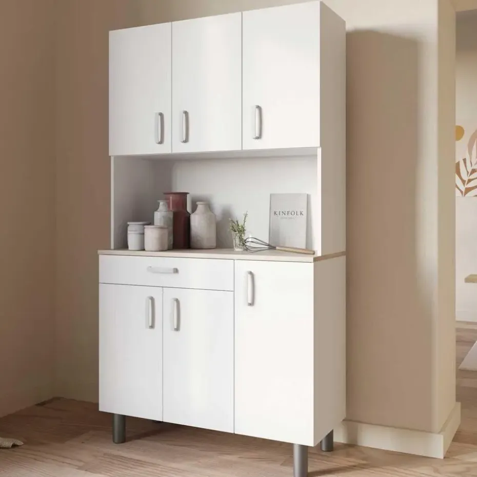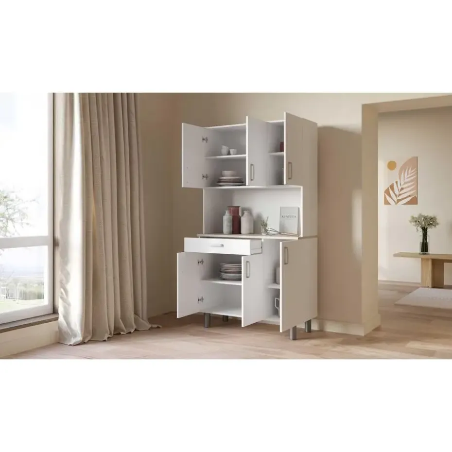 Deze neutrale buffetkast kan gemakkelijk geïntegreerd worden in bijna elk interieur. Het werkblad in Kronberg eikdecor geeft het meubel een mooi natuuraccent. Achter de 4 draaideuren is er veel opbergruimte voorzien voor uw servies en voorraad. De handige lade biedt plaats aan uw bestek. Het open vak kunt u vrijlaten om als werkblad te gebruiken of u kunt er allerhande keukenapparatuur zoals een microgolfoven of koffiemachine in plaatsen. Houd uw keuken gemakkelijk opgeruimd met buffetkast Gabe.