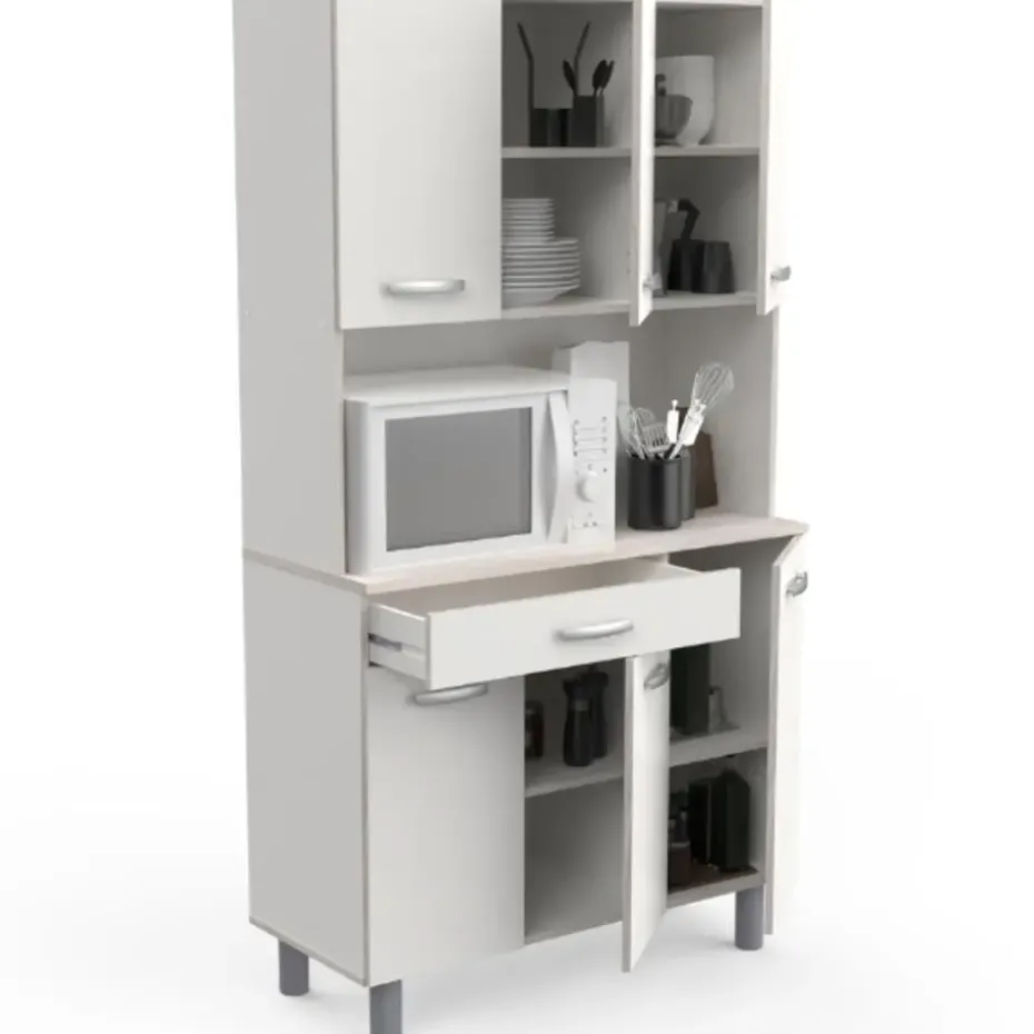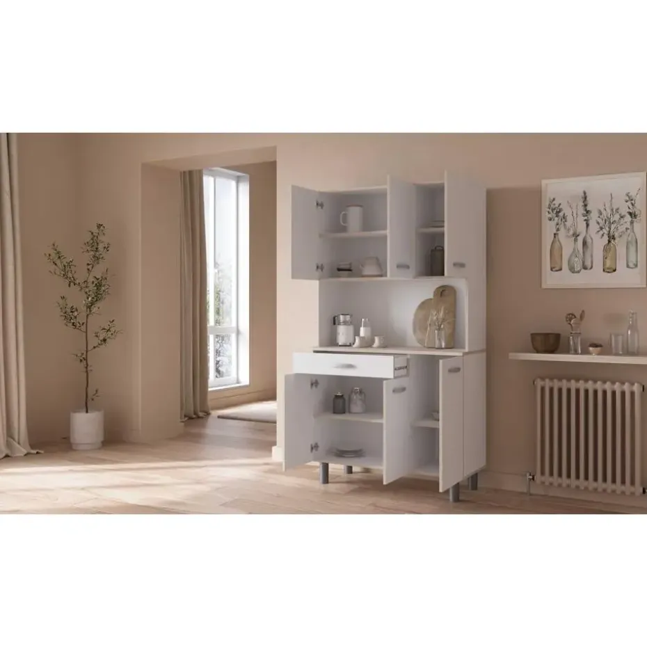 Het neutrale ontwerp van deze buffetkast maakt dat hij gemakkelijk geïntegreerd kan worden in bijna elk interieur. De kast krijgt karakter door het werkblad in prachtig acaciadecor. Deze ruime buffetkast heeft een lade voor uw bestek en 6 draaideuren met daarachter opbergruimte voor uw servies, kookpotten, voorraad en keukengerei. In het open vak kan een microgolfoven, koffiemachine of andere keukenapparatuur geplaatst worden. Buffetkast Pavel is een veelzijdige uitbreiding voor uw keuken! Schroeven en pluggen voor wandmontage zijn niet inbegrepen.