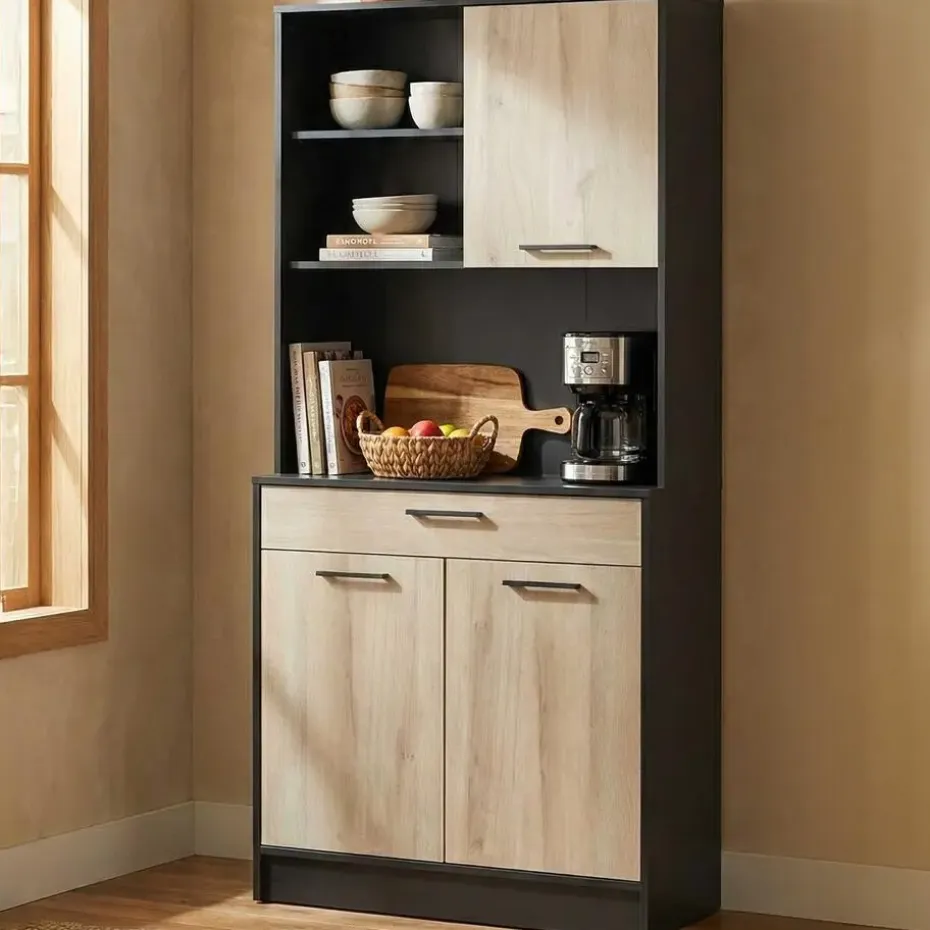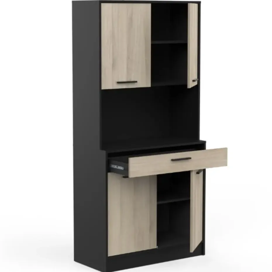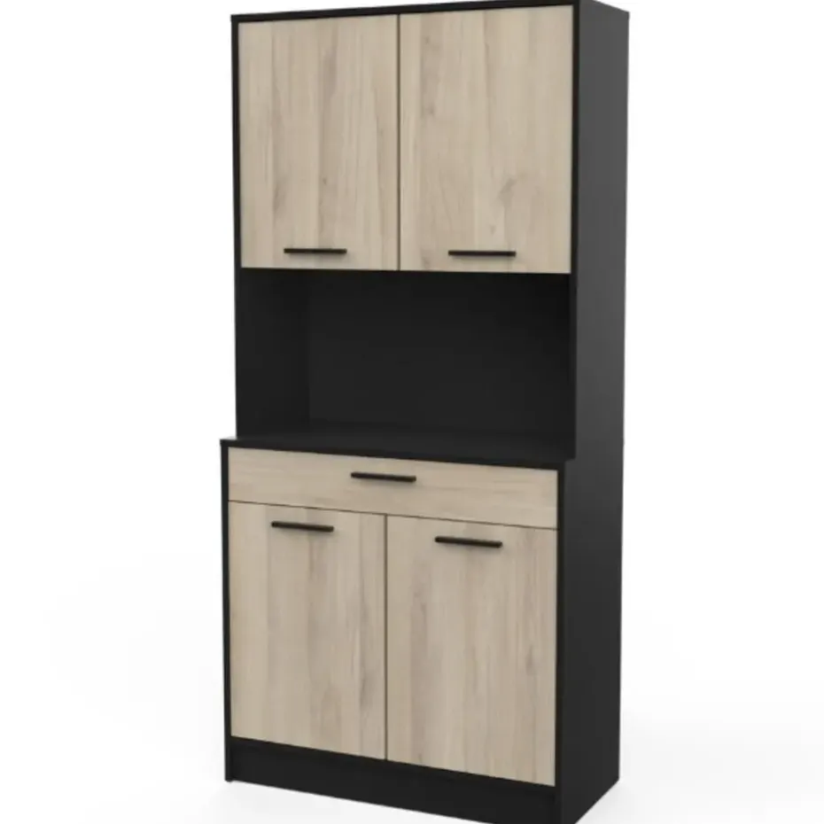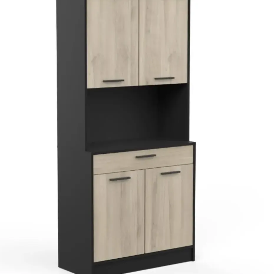 De combinatie van het strakke matzwart en het lichte kronberg eikdecor van buffetkast Romanie is een echte voltreffer. Deze kast beschikt over een lade voor uw bestek en 4 draaideuren met daarachter 2 legplanken voor allerhande keukengerei, kruiden, etc. In het open vak is er plaats voor eventueel een microgolfoven of andere keukenapparaten. Deze kast kan tegen de muur gemonteerd worden, de schroeven en pluggen hiervoor dient u zelf te voorzien.