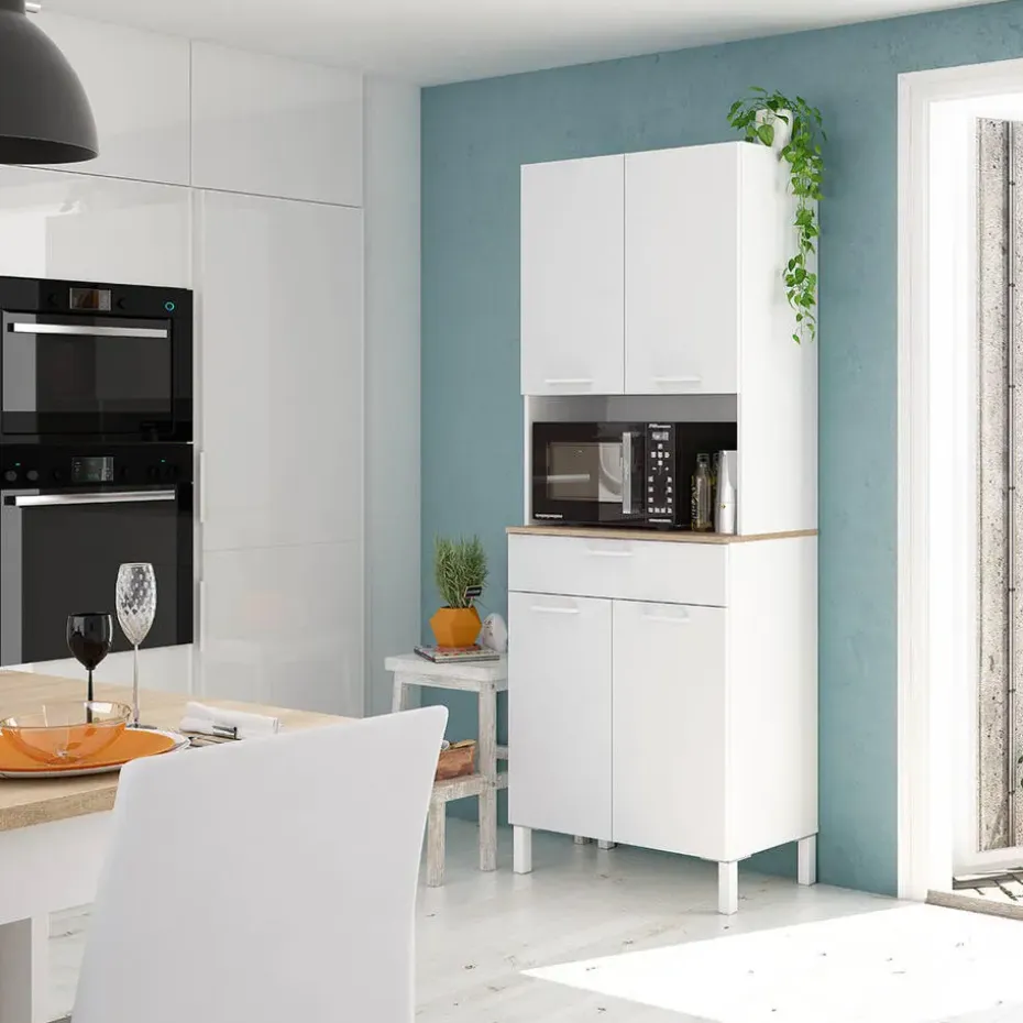 Ontdek onze Keukenbuffet met 4 deuren + 1 lade en 1 open compartiment de vele opbergmogelijkheden stellen je in staat om de elementen van je keuken te organiseren, voedsel, servies, keukengerei en andere items naar keuze op te bergen. Het eigentijdse ontwerp past bij veel keukens.Productkenmerken:Keukenbuffet met 4 deuren + 1 lade en 1 open compartiment.Spaanplaten met melamine oppervlak.4 deuren met scharnieren en lade met metalen geleiders, poten van wit getint ABS.Afmetingen van het product:Lengte: 72 cm x Breedte: 40 cm x Hoogte: 186 cm – Netto gewicht: 45,28 kg.Afmetingen van het pakket:Pakket nr. 1: Lengte 52,2 cm x Hoogte 210 cm x Diepte 10,2 cm – Bruto gewicht: 46,2 kg.