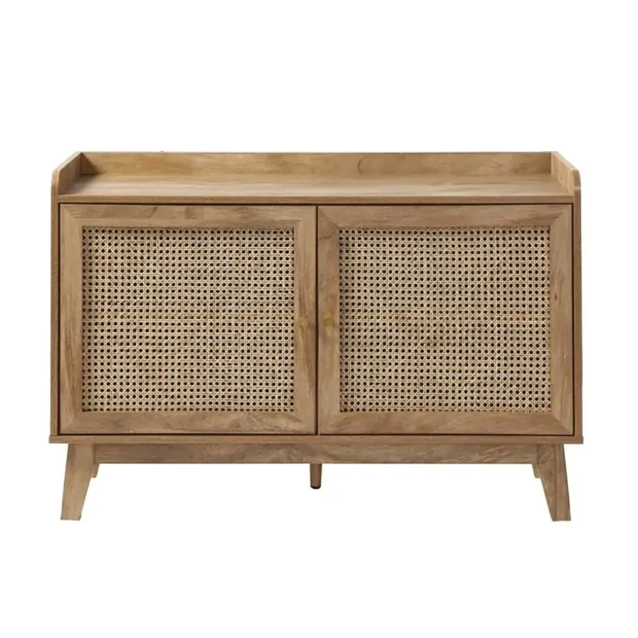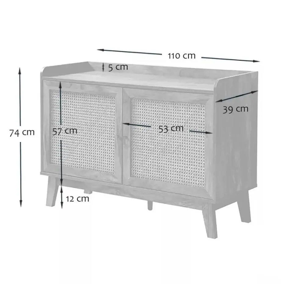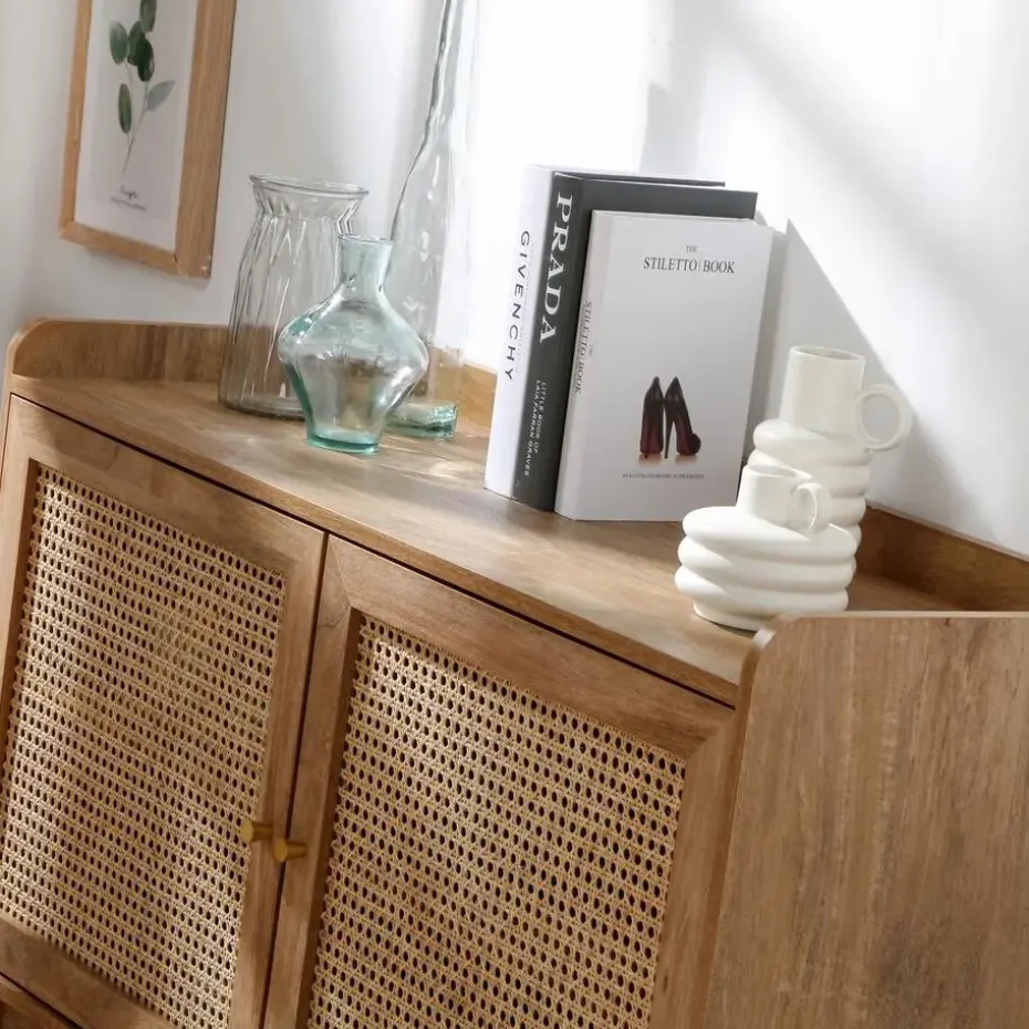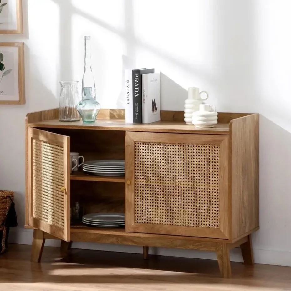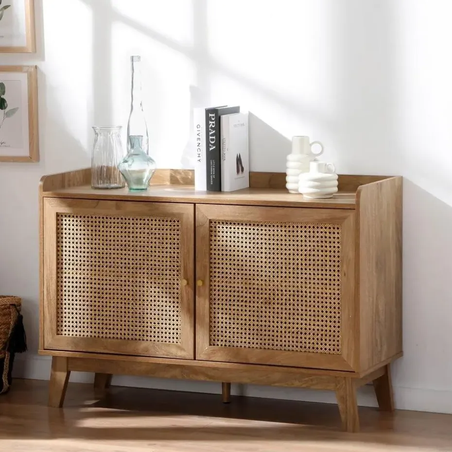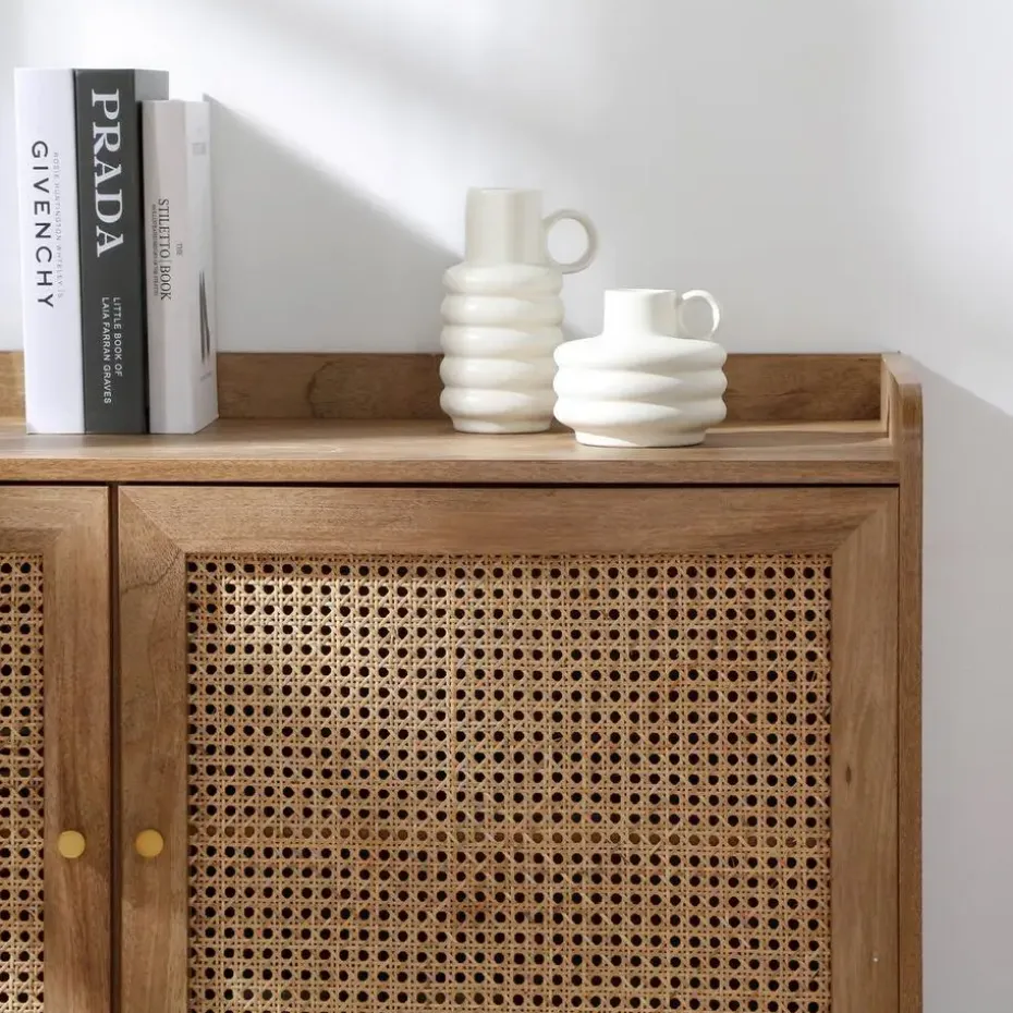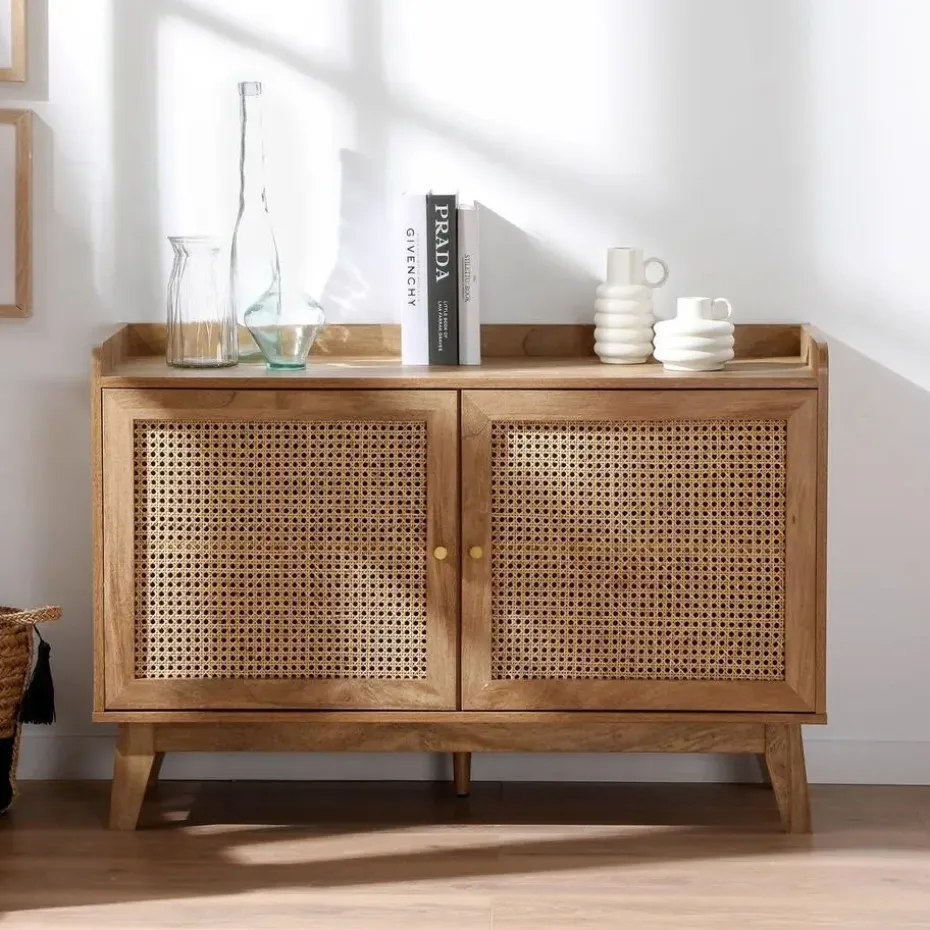 Buffetkast met 2 deuren, ontworpen met deuren van rotan en randen aan de bovenkant voor een elegante en natuurlijke touch. De metalen knoppen geven een moderne uitstraling, terwijl achter elke deur een plank schuilgaat, wat zorgt voor praktische en georganiseerde opbergruimte.