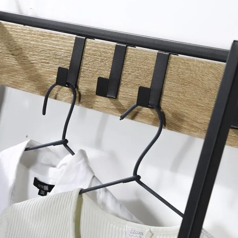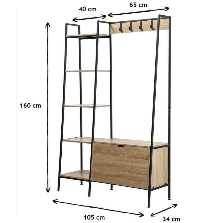 Ontdek onze garderobekast met 4 haken en 5 legplanken met schoenendoos, de ideale opbergcombinatie voor het inrichten van een inkomhal, een gang of een kleedkamer. Dit meubelstuk is gemaakt van hout en is zeer goed bestand tegen slijtage. Het zal in elke kamer van het huis geweldig staan! Dit meubel is gemaakt van resistente houten panelen bedekt met een imitatie eiken afwerking. De structuur is gemaakt van mat zwart metaal. Het zal er geweldig uitzien in elke kamer! Deze meubelset zal er geweldig uitzien in uw huis of kantoor! Hij wordt geleverd in een bouwpakket met een gebruiksaanwijzing en alle benodigde schroeven en bouten, dus u heeft maar een paar minuten nodig om hem in elkaar te zetten! Wandbevestiging is niet nodig, de kast staat op zijn 4 poten. Kenmerken van de kleerkast: Materialen: 12 mm resistente spaanplaat / zwart mat stalen structuur. Afmetingen: B 105 x D 35 x H 160 cm . Gewicht : 21.4 Kg