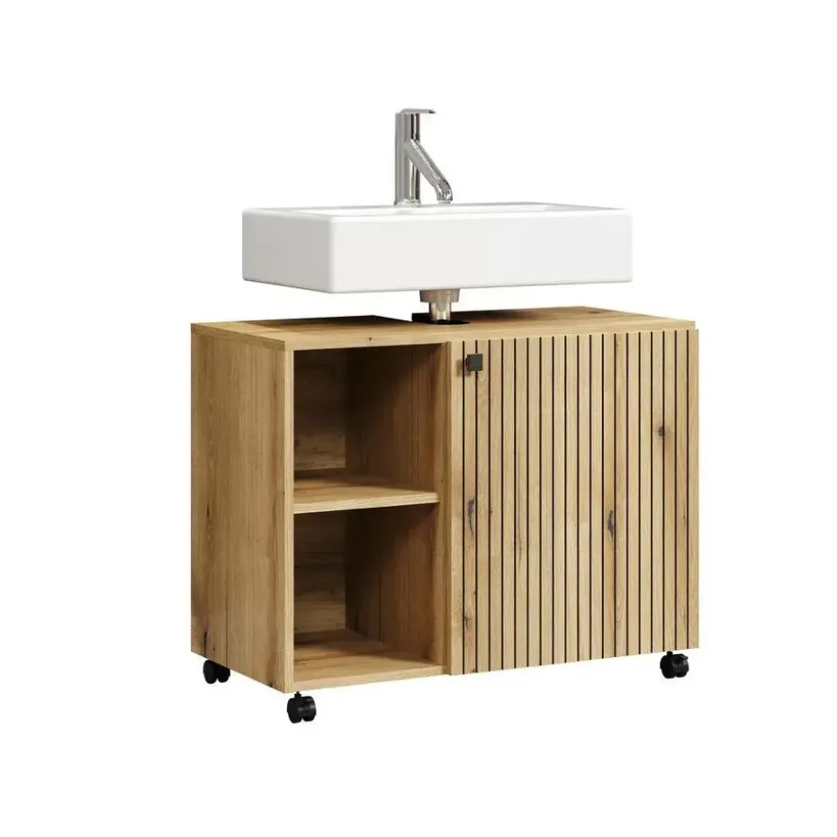 - Waschbeckenschrank mit Rollen, 1 Tür, 2 Nischen und 2 Einlegeböden.