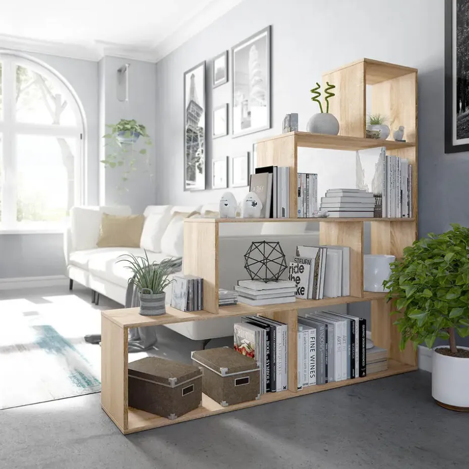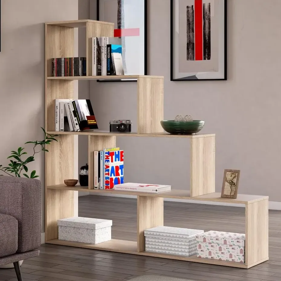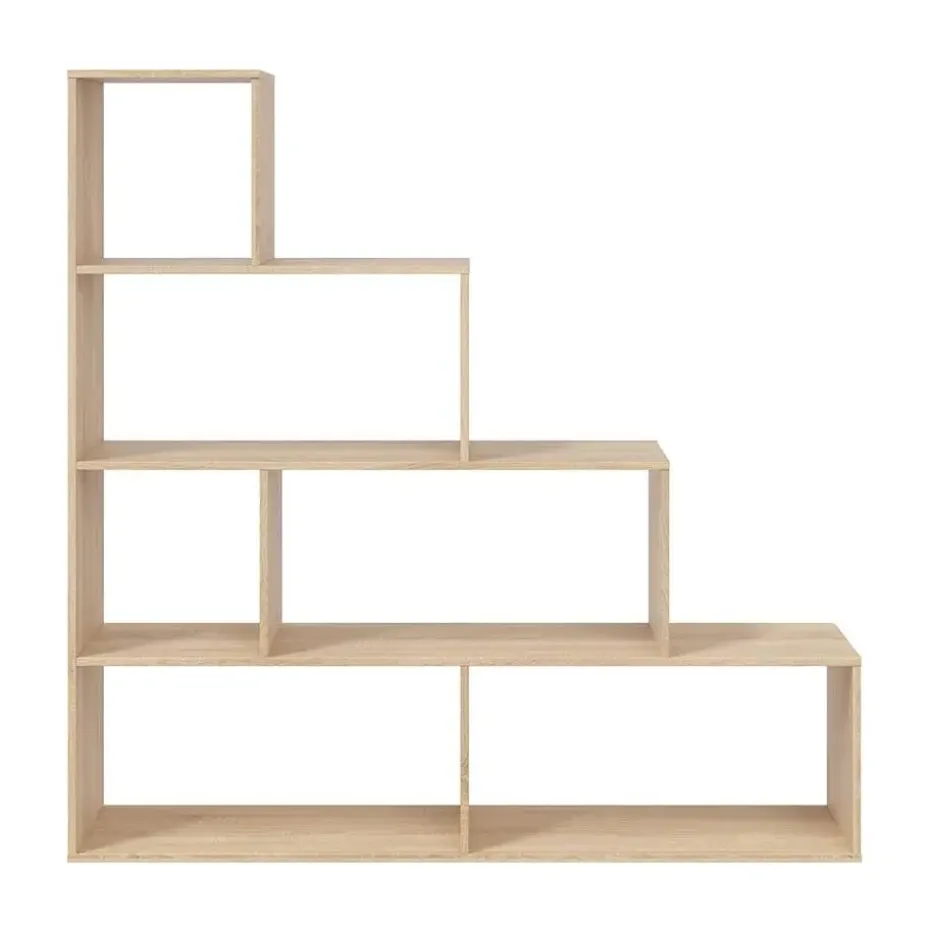 Ontdek onze trapvormige boekenkast met 6 vakken, ideaal om opbergruimte te creëren terwijl je een kamer verdeelt in twee zeer verschillende ruimtes, zoals bijvoorbeeld een slaapkamer met een slaapgedeelte en een speelgedeelte. Dankzij de trapvorm kun je deze boekenkast plaatsen in schuine ruimtes, zoals een zolderkamer of zelfs onder een trap.Kenmerken:Verkrijgbaar in twee kleuren: wit of lichte eikendecoratie.6 opbergvakken.Kast als ruimteverdeler.Trapvorm: geschikt voor beperkte ruimtes.Samenstelling van het product:Spaanplaat met melamine/metaal.Afmetingen van het product:Hoogte 145 cm x Lengte 145 cm x Diepte 29 cm – Netto gewicht: 25,33 kg.Afmetingen van het pakket:Hoogte 158 cm x Lengte 30,2 cm x Diepte 11,2 cm – Bruto gewicht: 25,85 kg.