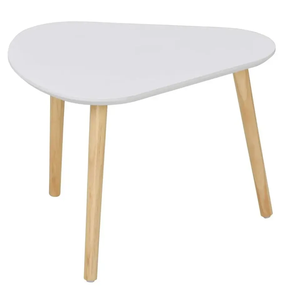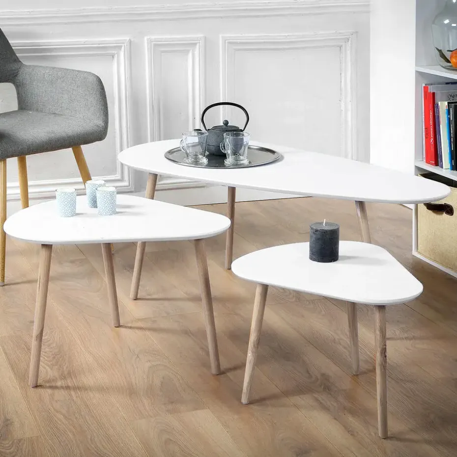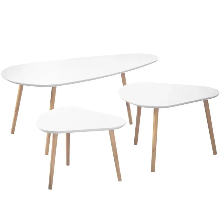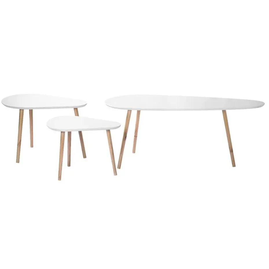 Ontdek onze set van 3 witte en houten nesttafels en pas je woonkamer aan naar je wensen en behoeften. Met hun witte bladen en houten poten brengen de tafels een zeer trendy Scandinavische stijl met zich mee. Dankzij de drie nesttafels kun je je familie en vrienden ontvangen zonder bang te zijn voor ruimtegebrek. Onze set van 3 witte en houten nesttafels is perfect voor kleine ruimtes en biedt aanzienlijke ruimtebesparing.Productkenmerken:Set van 3 nesttafels.Witte MDF bladen bedekt met PVC.Houten poten.Productafmetingen:Grote tafel: lengte 103 cm x diepte 50 cm x hoogte 42 cm.Middelste tafel: lengte 55 cm x diepte 48 cm x hoogte 37 cm.Kleine tafel: lengte 45 cm x diepte 40 cm x hoogte 32 cm.Nettogewicht van de set: 8 kg.Afmetingen van het pakket :Lengte 111 cm x Hoogte 12 cm x Diepte 56 cm – Brutogewicht: 9 kg.