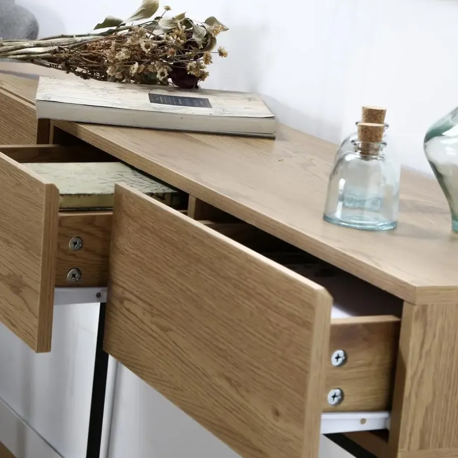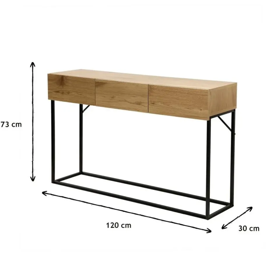 De consoletafel zal prachtig staan in uw woonkamer of in uw eetkamer. Dankzij de tijdloze industriële stijl en het moderne design past de console in elk universum en in elke kamer van het huis! Dit meubel is gemaakt van resistente houten panelen bedekt met een imitatie eiken afwerking, de structuur is gemaakt van mat zwart staal. De structuur is gemaakt van zwart mat staal, dus hij zal lang meegaan! De console heeft een grote lade om uw spullen of decoraties op te zetten, het heeft ook 3 lades, praktisch om bijvoorbeeld uw sleutels en brieven in op te bergen! De laden van de console hebben geïntegreerde handgrepen om deze vlotte en moderne look te behouden! Dit meubel komt bij u thuis in kitvorm met instructies en alle nodige schroeven en bouten, u hebt maar weinig tijd nodig om het op te zetten! Kenmerken van de Console: Materialen: Resistente spaanplaat / Matzwarte stalen structuur. Afmetingen: B 120 x D 29,5 x H 73 cm Hoogte van de vloer tot de laden: 56 cm . Gewicht : 17.2 Kg