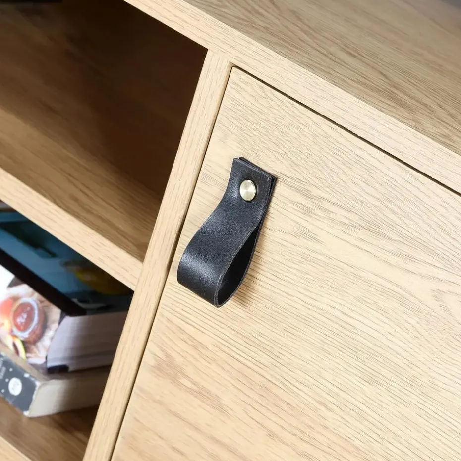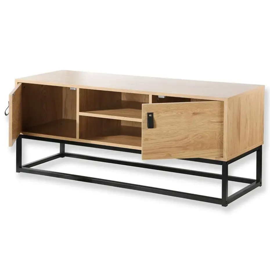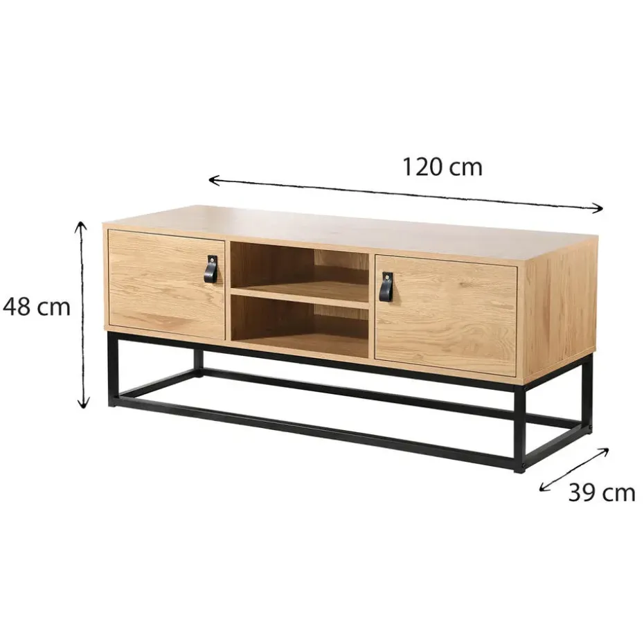 Op zoek naar een nieuw TV-meubel? Ontdek onze Eiken Decor TV-meubel met 2 deuren en centrale nissen – L120 cm Met zijn 2 deuren en 2 nissen profiteert u van een grote opbergruimte voor uw afstandsbedieningen, DVD, spelconsole, enz. Deze 2-deurs TV-standaard in hout en zwart metalen poten brengt een tijdloze industriële stijl in uw woonkamer. Industriële TV-standaard die zwart metaal mengt met een houtlook met nerven! 4 bergplaatsen beschikbaar: 2 deuren, 2 nissen Eenvoudig te monteren set met montagehandleiding en alle benodigde schroeven en bouten. Afmetingen van de nissen: B40 x H11,7 cm / Afmetingen van de opbergruimte achter de deur: B36,5 x D37,5 x H25 cm Afmetingen: B 120 cm X D 39 cm X H 48 cm Materialen: spaanplaat, metaal Gewicht: 23 kg