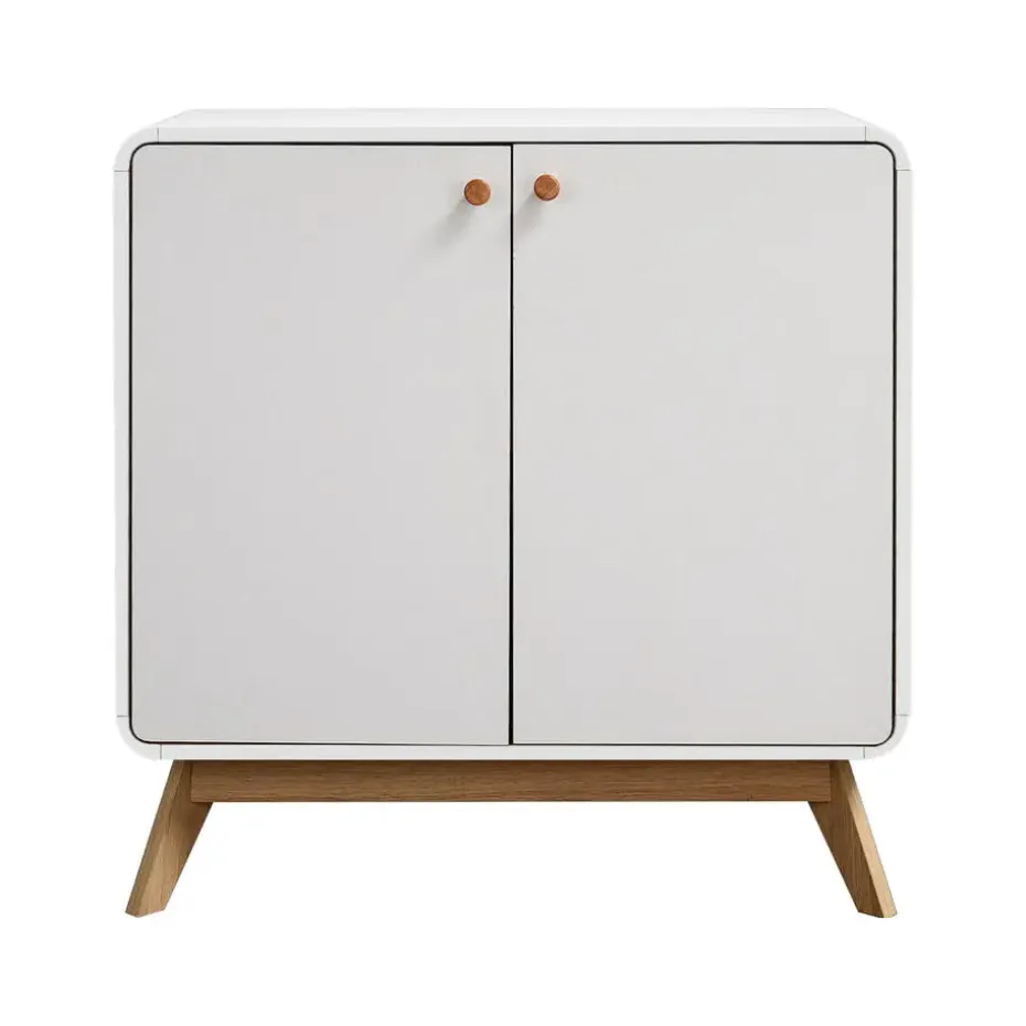 Dit dressoir is de droom van een designliefhebber en lost opbergproblemen stijlvol op. Het tweekleurige kleurenpalet, het slanke silhouet, de afgeronde hoeken en taps toelopende poten dragen bij aan de Scandinavisch geïnspireerde uitstraling, terwijl de twee binnenplanken voor veel opbergruimte zorgen. Hij is verkrijgbaar in verschillende afwerkingen om bij je bestaande inrichting te passen.
