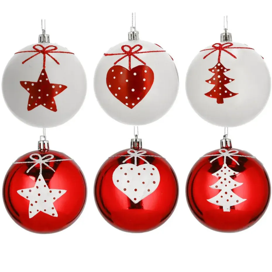Breng een klassieke en vrolijke sfeer in je kerstboom met deze set van 6 gedecoreerde kerstballen in de basis kleuren rood en wit. Met een diameter van 6 cm zijn ze ideaal om je boom prachtig te versieren. Gemaakt van duurzaam kunststof, zijn deze ballen perfect voor een feestelijke look die ook kindvriendelijk is. Elke bal heeft een standaard lusje, maar voor een betere bevestiging raden we aan om kerstbalhaakjes te gebruiken.