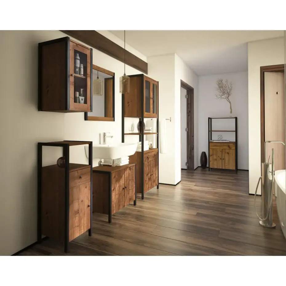 Het badkamermeubel, gemaakt van FSC®-gecertificeerd hout, maakt ideaal gebruik van de ruimte onder de wastafel. Dankzij de sifonuitsparing kan het meubel onder bijna alle standaard wastafels worden geplaatst. Achter de kastdeuren bevindt zich een ruim vak voor het opbergen van schoonmaakmiddelen en andere spullen. Bovendien combineert het badkamermeubel een chique uitstraling met een moderne, landelijke stijl. Het wordt gekenmerkt door de ongewone look van het frame. De ronde metalen handgrepen zijn een ander hoogtepunt. Verkrijgbaar in twee kleuren.