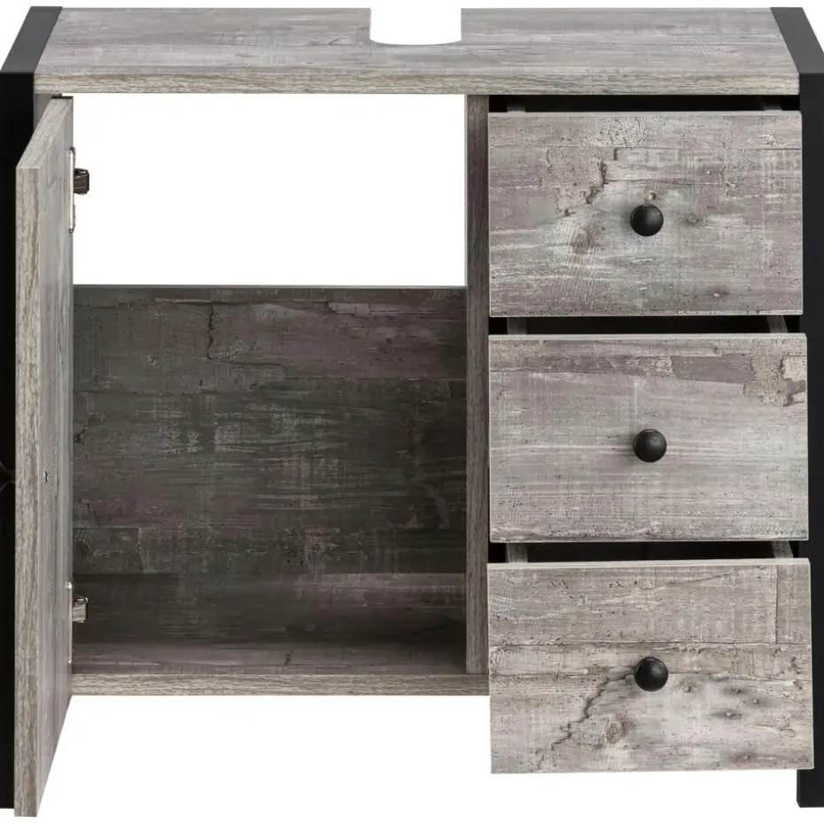 Dit meubel combineert rustieke accenten met industriële charme en biedt voldoende opbergruimte in de badkamer. Het badmeubel springt in het oog met zijn aluminium frame in metallic-look, dat de knopvormige handgrepen aanvult. In de afdekplaat is een praktische uitsparing voor de sifon geïntegreerd, zodat het badkamermeubel direct onder de wastafel geplaatst kan worden. De ruimte in het meubel is functioneel verdeeld in opbergniveaus achter de deur en laden op metalen rails. Het badkamermeubel is gemaakt van FSC®-gecertificeerd hout en is verkrijgbaar in verschillende kleuren.