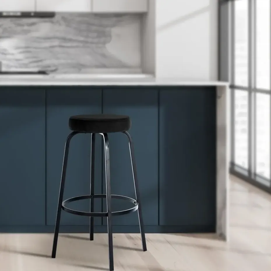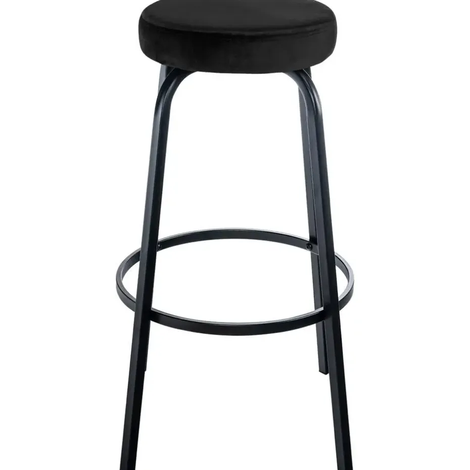 De Kamari barkruk maakt indruk met zijn tijdloze combinatie van een ronde gestoffeerde zitting en een matzwart metalen onderstel met vier poten.