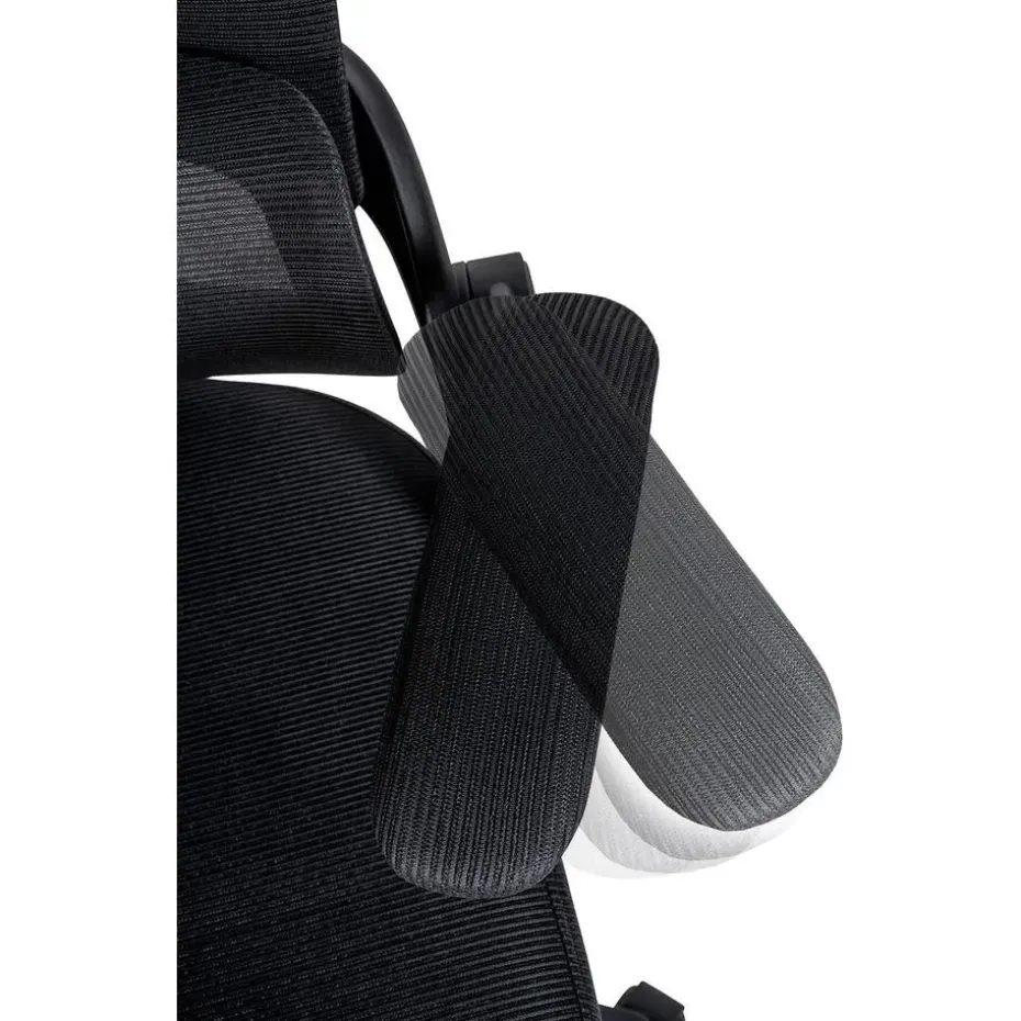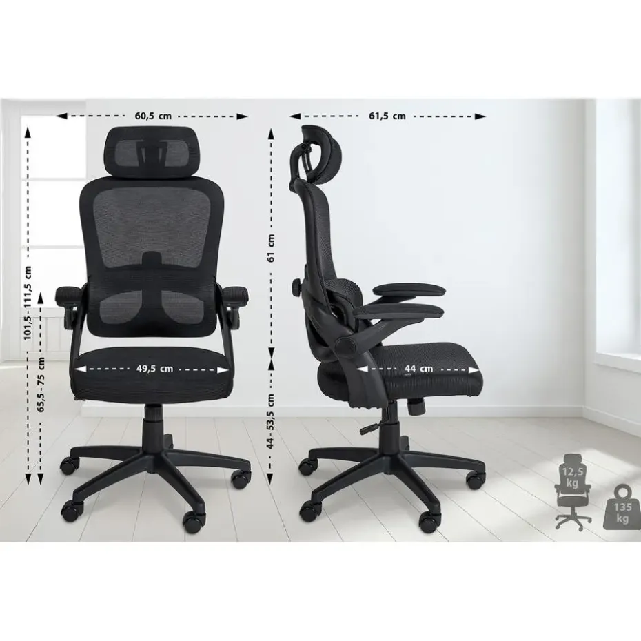 De lendensteun en de hoofdsteun (elk in hoogte verstelbaar) zijn bijzonder weldadig en ook de armleuningen zorgen voor ontspanning. De armleuningen kunnen naar voren, naar achteren en opzij worden gedraaid. Bovendien kunnen de armleuningen worden opgeklapt zodat de stoel naar de rand van het bureau kan worden verplaatst. Natuurlijk is de bureaustoel in hoogte verstelbaar. En de stoel heeft een kantelfunctie waarbij de uitgangspositie ook vastgezet kan worden.