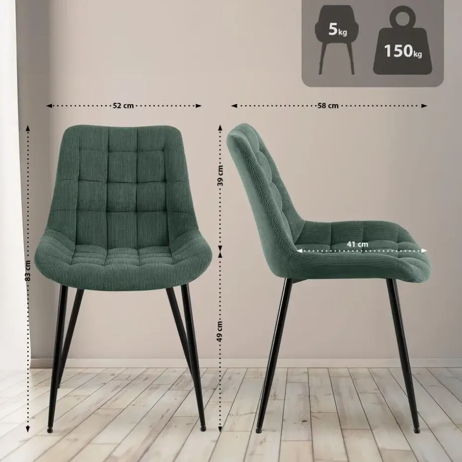 De Eetkamerstoel Sardna combineert hoog zitcomfort met een moderne en tijdloze uitstraling. Perfect voor uw eettafel, keuken, woonkamer of andere ruimtes. De stoel biedt een uitstekende keuze dankzij de comfortabele zitting en rugleuning. De doorlopende cordbekleding met een stijlvol quiltpatroon trekt meteen de aandacht.