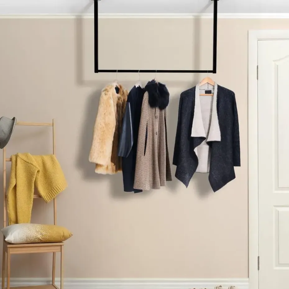 De plafondbevestiging is een speciaal kenmerk dat ook veel combinatiemogelijkheden biedt. De hanger kan bijvoorbeeld worden gecombineerd met een ladekast, een dressoir of een schoenenrek. Met genoeg ruimte voor jassen, shirts en blouses houdt deze open kledingroede kleding kreukvrij en altijd binnen handbereik.