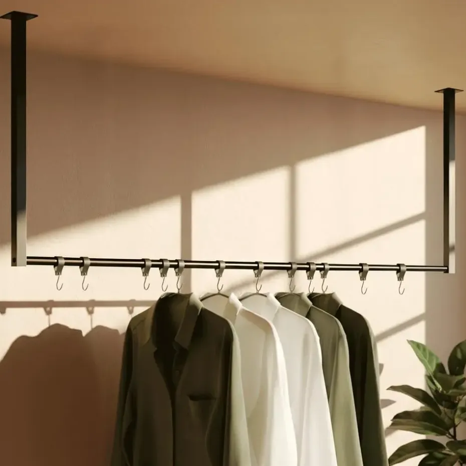 De plafondbevestiging is een speciale functie, die ook veel combinatiemogelijkheden biedt. De hanger kan bijvoorbeeld worden gecombineerd met een ladekast, een dressoir of een schoenenrek. Met genoeg ruimte voor jassen, shirts en blouses houdt deze open kledingroede kleding kreukvrij en altijd binnen handbereik.