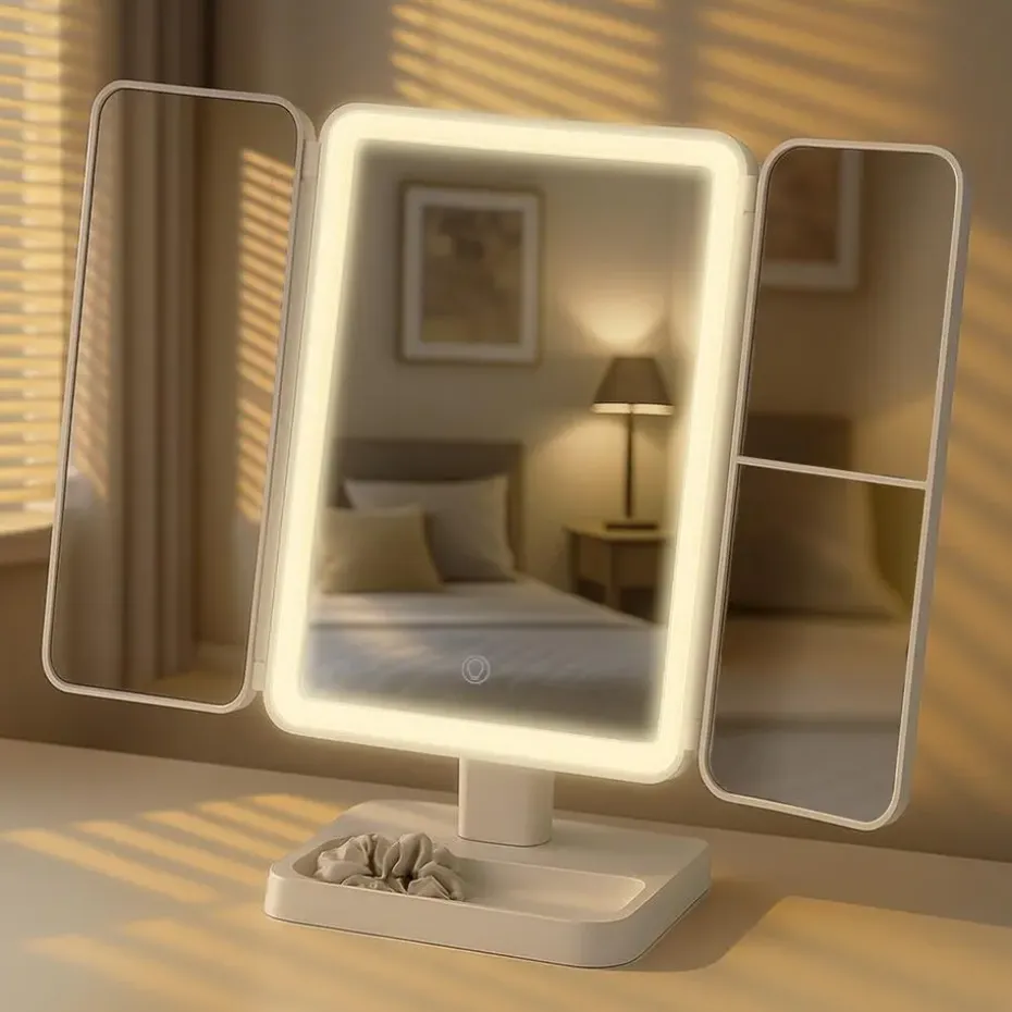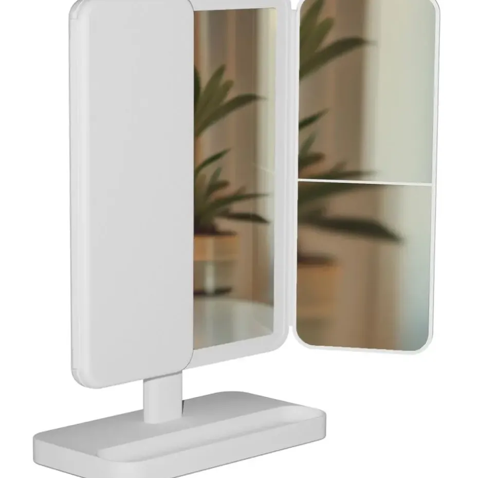 Met zijn hoekige opklapbare behuizing van metaal en glas past de cosmeticaspiegel optisch in elke moderne woonomgeving. Het biedt functionaliteit, duurzaamheid en mobiliteit in één.