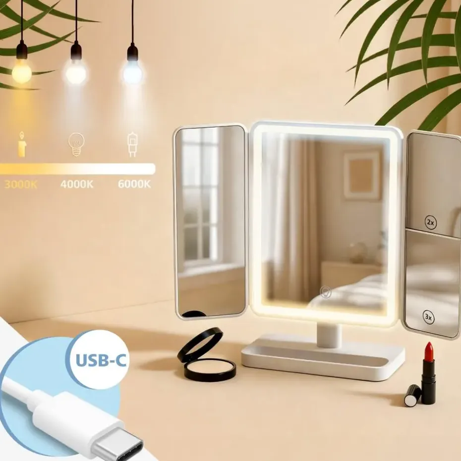 De USB-C-aansluiting maakt eenvoudig en betrouwbaar opladen mogelijk, zonder batterijen. Een passend kabeltje is inbegrepen in de levering. Het compacte formaat en de stabiele voet maken de spiegel veelzijdig inzetbaar, bijvoorbeeld thuis op de kaptafel en in de badkamer.