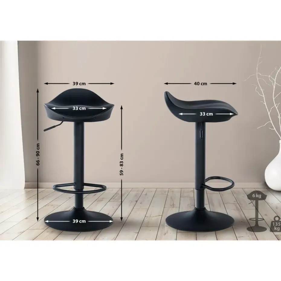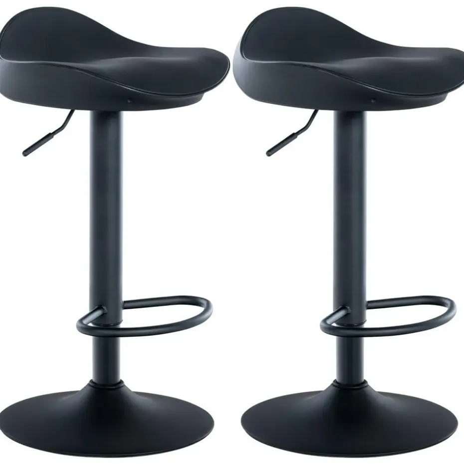 De ergonomische vorm nestelt zich perfect tegen het lichaam en de stoelbekleding van zacht, gestructureerd kunstleer zorgt voor een aangenaam zitoppervlak. De traploos instelbare gaslift maakt deze barstoelen geschikt voor alle baliehoogten en biedt een universeel toepasbare oplossing. Dankzij de geïntegreerde voetsteunen kunt u uw voeten comfortabel plaatsen en de 360° draaibare zittingen zorgen ervoor dat u urenlang comfortabel kunt zitten. De kunststof oppervlakken van de barkrukken zijn gemakkelijk te reinigen en de metalen trompetpoten geven deze meubelstukken een elegante uitstraling. Een rubberen ring op de poten van de barkrukken voorkomt beschadiging van de vloer.