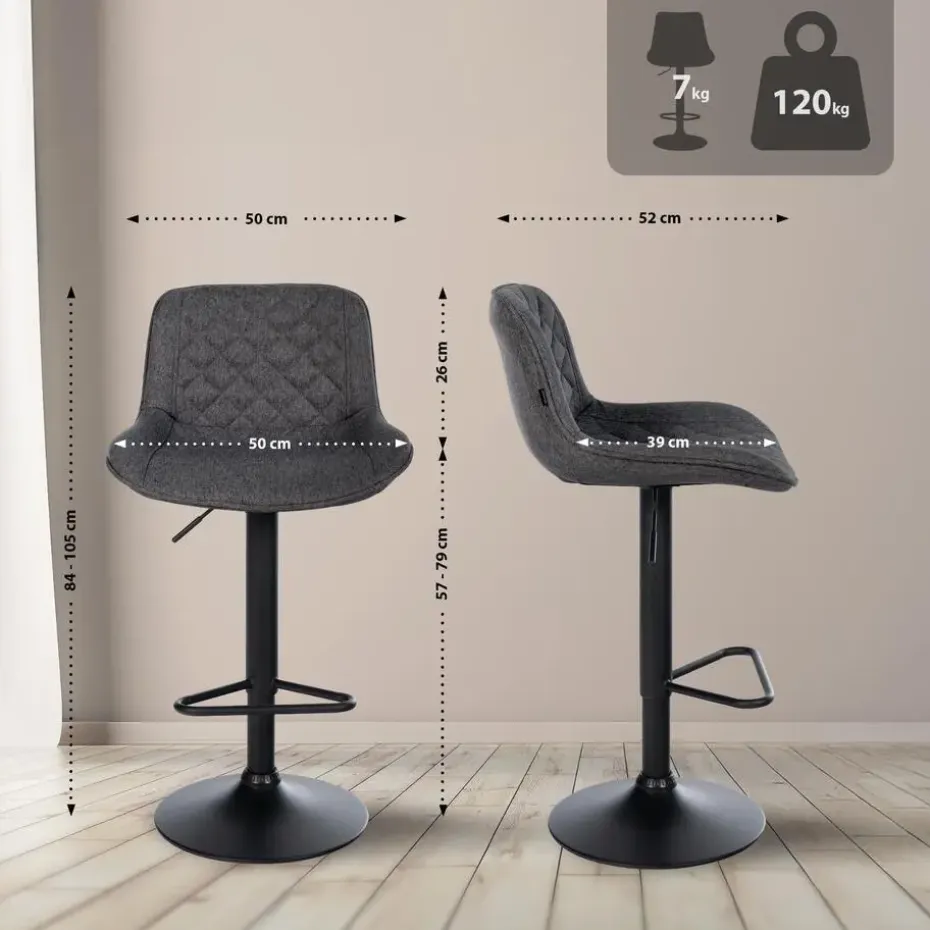 Dankzij de in hoogte verstelbare functie van 57 cm tot 79 cm kunt u de kruk individueel aanpassen voor comfort in elke situatie. De geïntegreerde voetensteun en gewatteerde zitting maximaliseren de zitervaring en nodigen uit om te blijven zitten. De draaibare functie van de barkrukken bevordert bewegingsvrijheid en interactie.