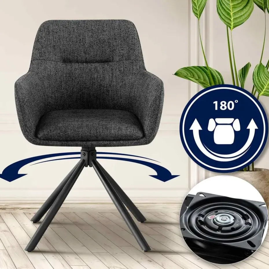 Het zogenaamde autoback draaimechanisme zorgt ervoor dat de zitting van de eetkamerstoel 180 graden kan draaien, wat zorgt voor extra bewegingsvrijheid. De comfortabele bekleding van de zitting, rugleuning en armleuningen is cruciaal voor een comfortabele zit. De zitschaal is bekleed met een onderhoudsvriendelijke en robuuste stoffen bekleding.