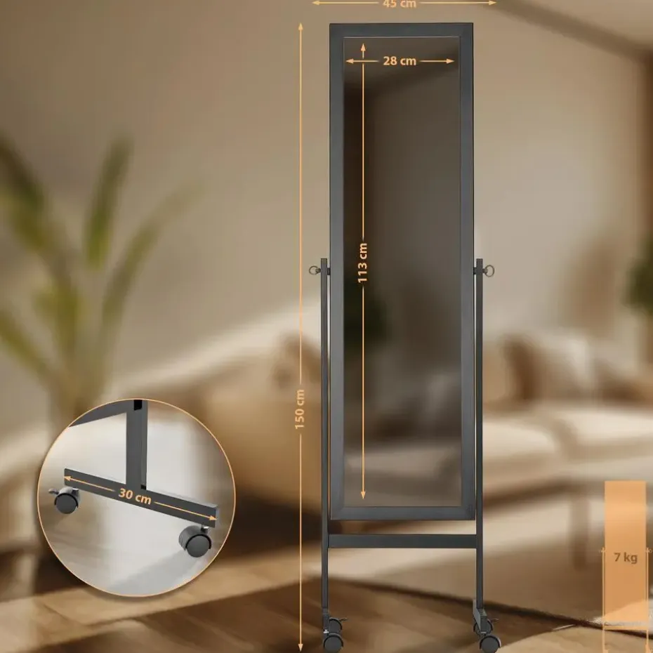 gelakt massief houten frame, staat de spiegel over de hele lengte op vier kunststof kunststof wielen die 360 graden kunnen draaien. Hierdoor is de spiegel gemakkelijk te verplaatsen.