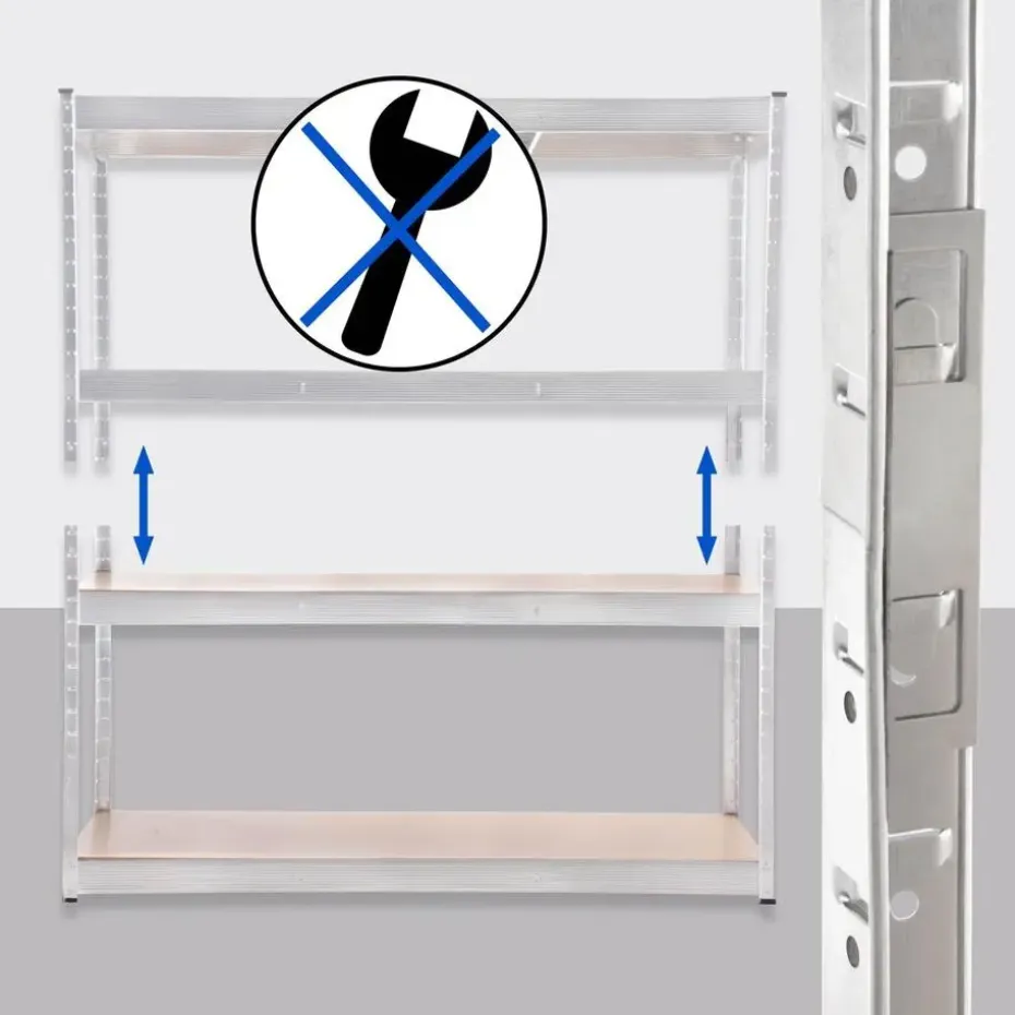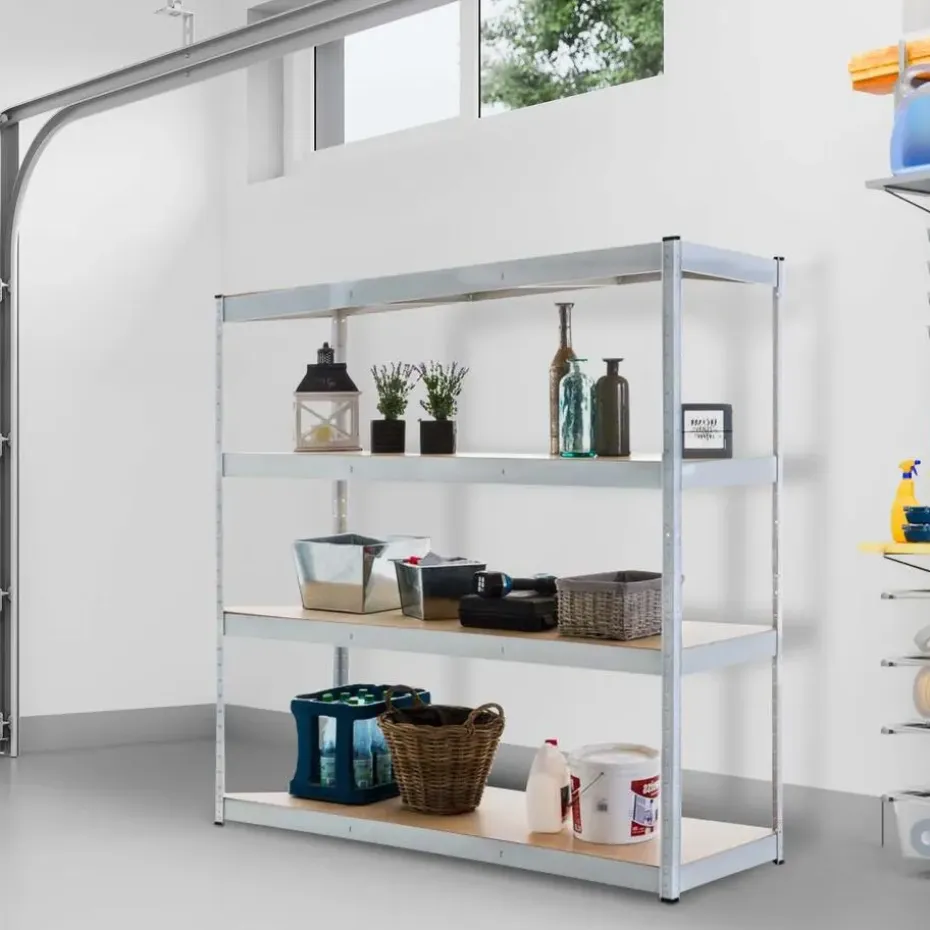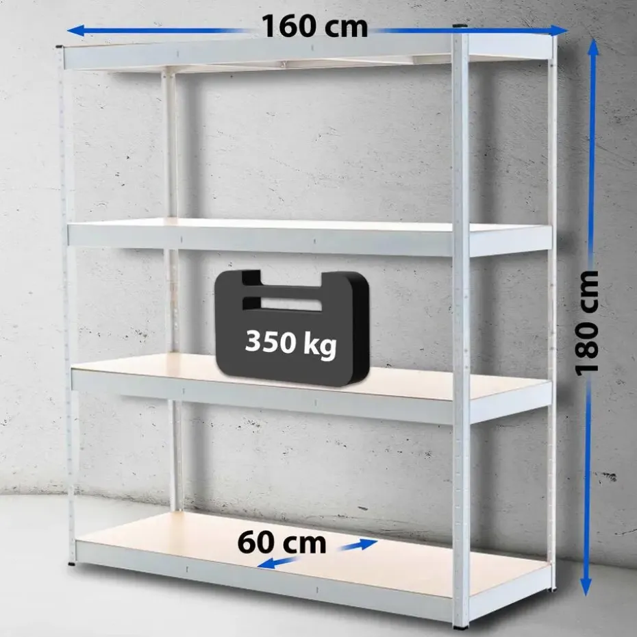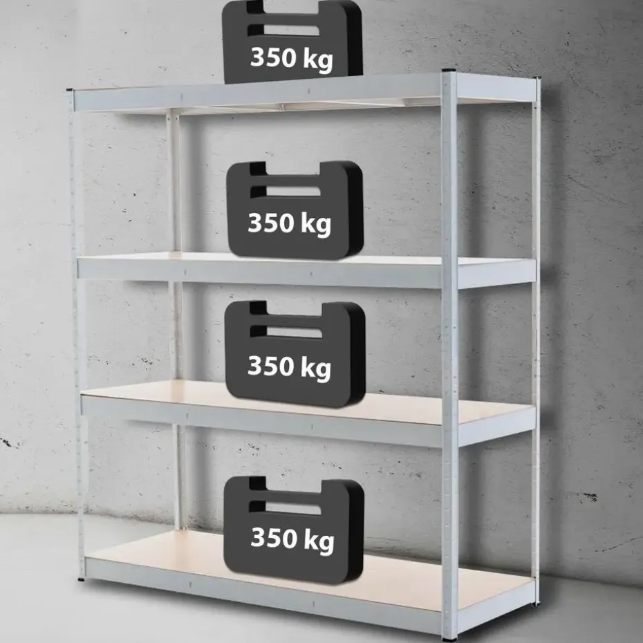 Dit magazijnstelling is ideaal voor het opbergen van zware spullen. In combinatie met het gegalvaniseerde metalen frame kan elk van de vier stellingniveaus maximaal 350 kilogram dragen, waardoor het totale draagvermogen van de magazijnstelling 1,4 ton bedraagt. Dankzij het insteeksysteem is de hoogte van de planken flexibel aan te passen.