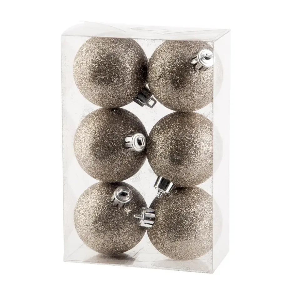 Glitter kerstballen in de kleur champagne. Voeg een vleugje glamour toe aan je kerstboom met deze set van 6x stuks glitter kerstballen. Met een diameter van 6 cm zijn deze onbreekbare kerstballen perfect voor het creeren van een sfeervolle en feestelijke uitstraling. Gemaakt van kunststof, zijn ze lichtgewicht en gemakkelijk te hangen.
