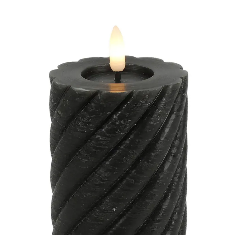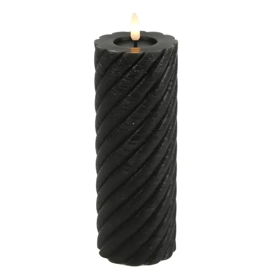 Luxe LED kaars/stompkaars in de kleur zwart. De luxe LED kaars is een elegante en stijlvolle kaars met gedraaide look en warm wit licht. Deze LED kaars heeft een afmeting van D7,5 x H20 cm. De kaars is voorzien van een timer, waarmee je de verlichting kunt instellen op een tijd die je wilt. De LED verlichting is energiezuinig en geeft een warm zwart, gezellig licht. Geschikt voor binnen. Voeding: 2 AA batterijen (niet inbegrepen. 250 werkuren. Materiaal: wax.