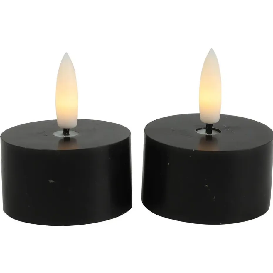 Set van 2x stuks theelichtjes/waxinelicht LED kaarsjes in de kleur zwart. De waxinelichtjes zijn gemaakt van kunststof en zijn gemakkelijk te bedienen. De kaarsjes werken ieder op 1 CR2032 knoopcel batterij, deze zijn inbegrepen en hebben een timer functie. Formaat kaarsje: D4 x H5,2 cm. Ze zijn veilig te gebruiken omdat ze geen echte vlam hebben. Ideaal voor thuis, restaurants, bars, hotels en meer.