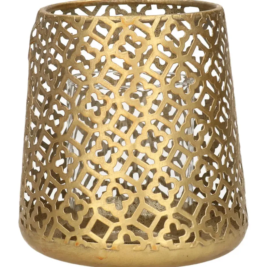 Luxe theelichthouder of kaarsenhouder voor waxinelichtjes met doorschijnend motief, gamaakt van metaal, in de kleur goud. Afmetingen: D14 x H15 cm. Plaats meerdere stuks of formaten van deze serie bij elkaar op tafel of vensterbank een maximale en stijlvolle sfeer. Serie: Morocco.