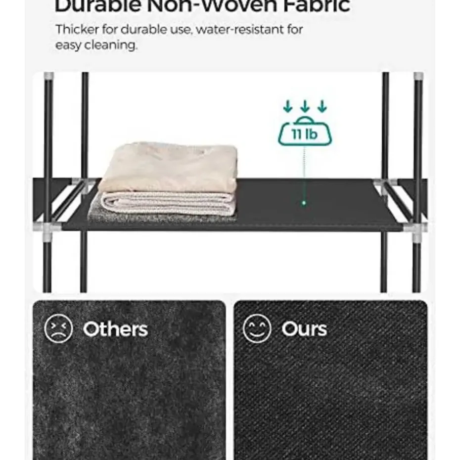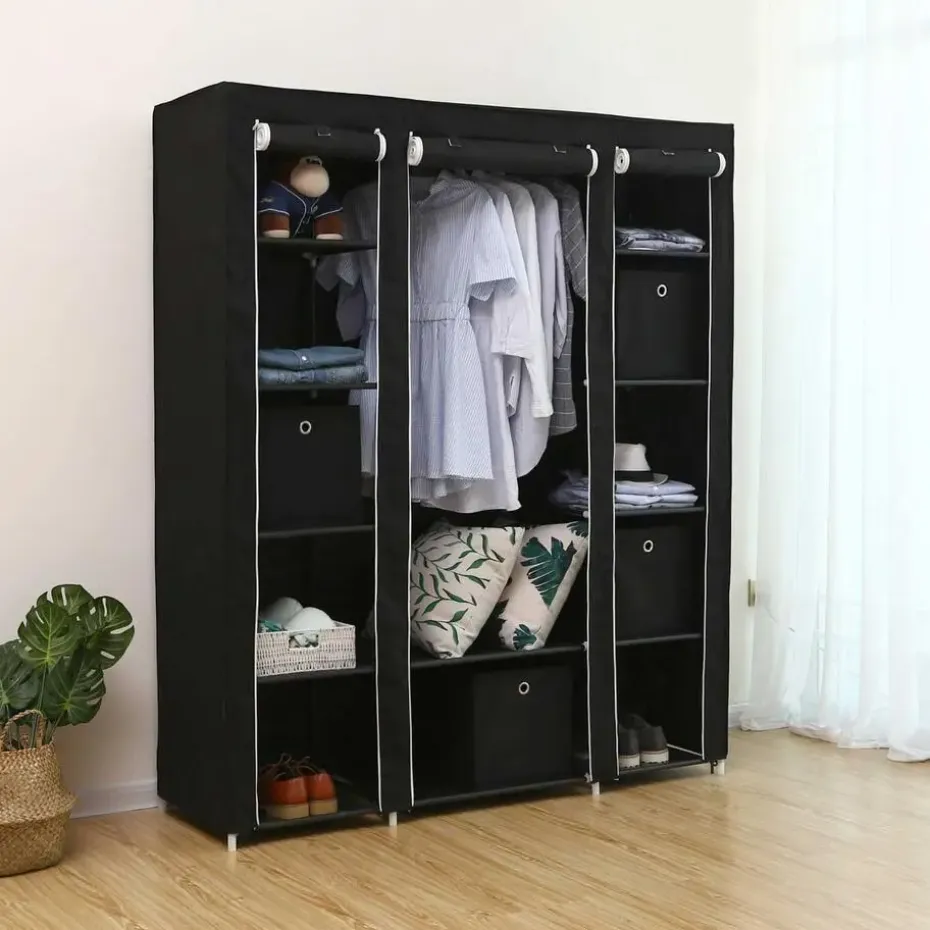 Maak kennis met onze draagbare kledingkast, een veelzijdige en ruimtebesparende oplossing voor al je kledingopbergbehoeften. Met zijn opvouwbare ontwerp en meerdere compartimenten is deze kledingopberger perfect voor slaapkamers, garderobes en zelfs studentenkamers. Een van de belangrijkste kenmerken van deze stoffen kledingkast is de grote capaciteit. Met zijn afmetingen van 45 x 150 x 175 cm biedt hij genoeg ruimte voor al je kleren. De 132 cm hoge ophangrail is speciaal ontworpen voor lange items zoals jassen en winterjassen, zodat ze goed opgeborgen en kreukvrij zijn. Hij is verdeeld in 12 secties, zodat je je kleding gemakkelijk kunt scheiden en organiseren. Hang je T-shirts en jassen aan de rail, berg opgevouwen broeken en hoeden op in de bovenste vakken en zet je schoenen op de onderste plank. Met deze garderobekast hebben al je spullen hun eigen plek, waardoor het makkelijker wordt om te vinden wat je nodig hebt.Duurzaamheid is een ander belangrijk kenmerk van deze draagbare garderobekast. Hij is gemaakt van 16 mm dikke metalen buizen, waardoor hij sterk en stabiel is. De plastic verbindingsstukken van hoge kwaliteit zorgen voor stevige verbindingen tussen de buizen, zodat de garderobe intact blijft. De 120 g/㎡ niet-geweven stoffen bekleding is zowel licht als duurzaam en beschermt je kleding tegen stof en vuil. Er is geen gereedschap nodig. Volg gewoon de bijgeleverde instructies en steek de buizen in de plastic verbindingsstukken. In een mum van tijd heb je een volledig geassembleerde kledingkast, klaar om je kleding in op te bergen. Het gemak van deze draagbare garderobekast houdt daar niet mee op. De stoffen bekleding is voorzien van een rits, zodat je hem gemakkelijk dicht kunt ritsen en je kleding beschermd blijft tegen stof. Je kunt de deur ook oprollen en open houden in je slaapkamer, zodat je gemakkelijker bij je kleding kunt terwijl je je klaarmaakt.Onze draagbare kledingkast wordt geleverd in een strakke zwarte kleur, die een vleugje elegantie toevoegt aan elke kamer. De gebruikte materialen zijn van hoge kwaliteit, wat de duurzaamheid en lange levensduur van de kledingkast garandeert. Hij is bestand tegen een maximale statische belasting van 5 kg per legplank en 15 kg voor de hangrail.Kortom, onze draagbare kledingkast biedt een praktische en ruimtebesparende oplossing voor je kledingopslag. Met zijn grote capaciteit, gecategoriseerde opslag en duurzame constructie houdt deze kledingkast je kleding georganiseerd en gemakkelijk toegankelijk.