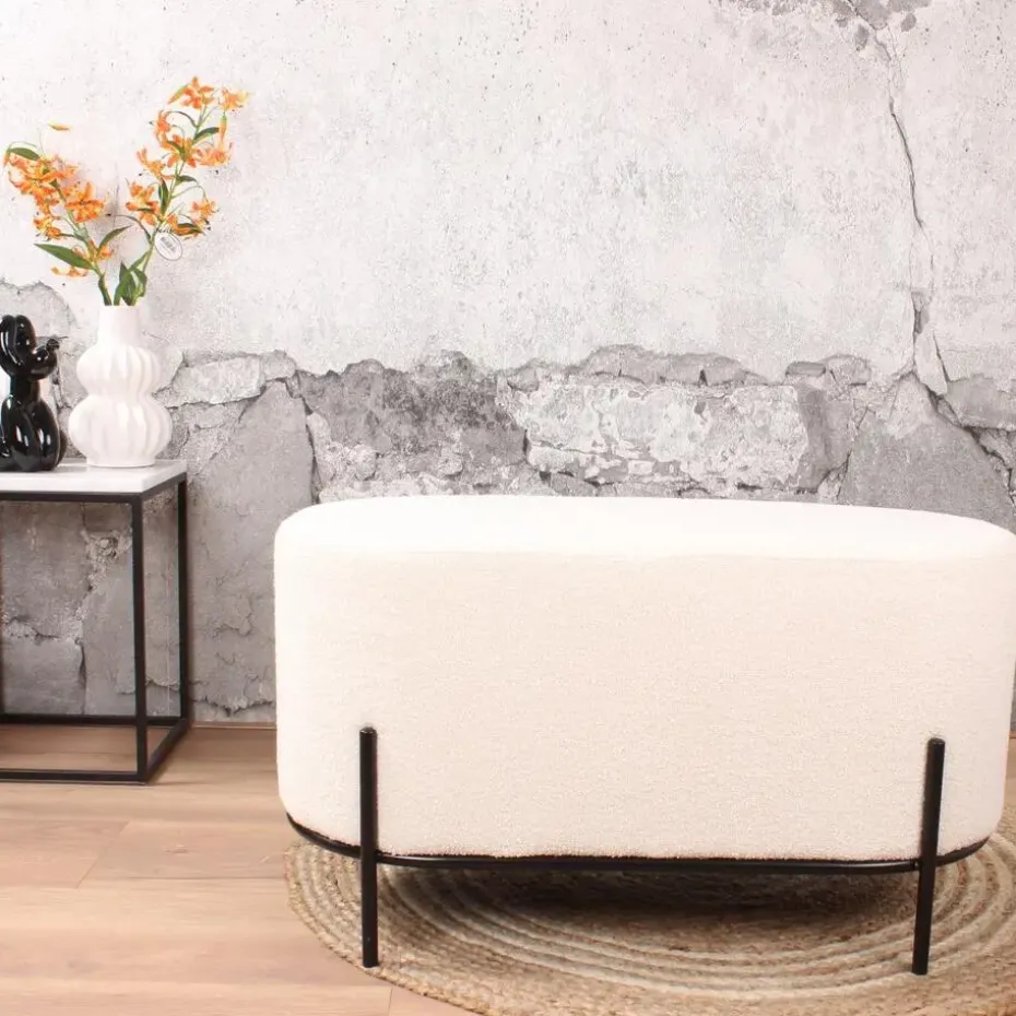 Deze trendy verschijning mag niet ontbreken in je interieur. Deze topper kun je werkelijk overal voor gebruiken; van zitplaats, voetenbank tot bijzettafel. Torben is een prachtige, royale ovalen poef van 80x40x42 cm. De robuuste basis geeft bepaalde stevigheid en maakt Torben een daadkrachtige verschijning. De 4 subtiele metalen poten uitgevoerd in zwart, lopen vanaf de grond langs de basis tot halverwege. Dit zorgt voor een simplistisch maar zeker indrukwekkend uiterlijk. Torben geeft een interieur sfeer en kan binnen heel veel verschillende woonstijlen worden geplaatst. Troy is verkrijgbaar in bouclé ivoor, beige en grijs. Voor ieder wat wils! Daarnaast is Torben in het klein te bestellen (35×38 cm).