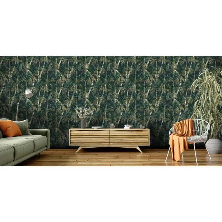 Met dit Dutch Wallcoverings vliesbehang uit de collectie Eden, ben je verzekerd van een mooi behang voor in je woonkamer of slaapkamer. Dit behang heeft een palmbomen / jungle behang motief in de kleur(en) zwart/groen. Met het vliesbehang Eden palmbomen zwart/groen creëer je een botanische sfeer in je interieur. Dit behang heeft een afmeting van 10m x 53cm en heeft een aansluitend rapport van 53 cm.