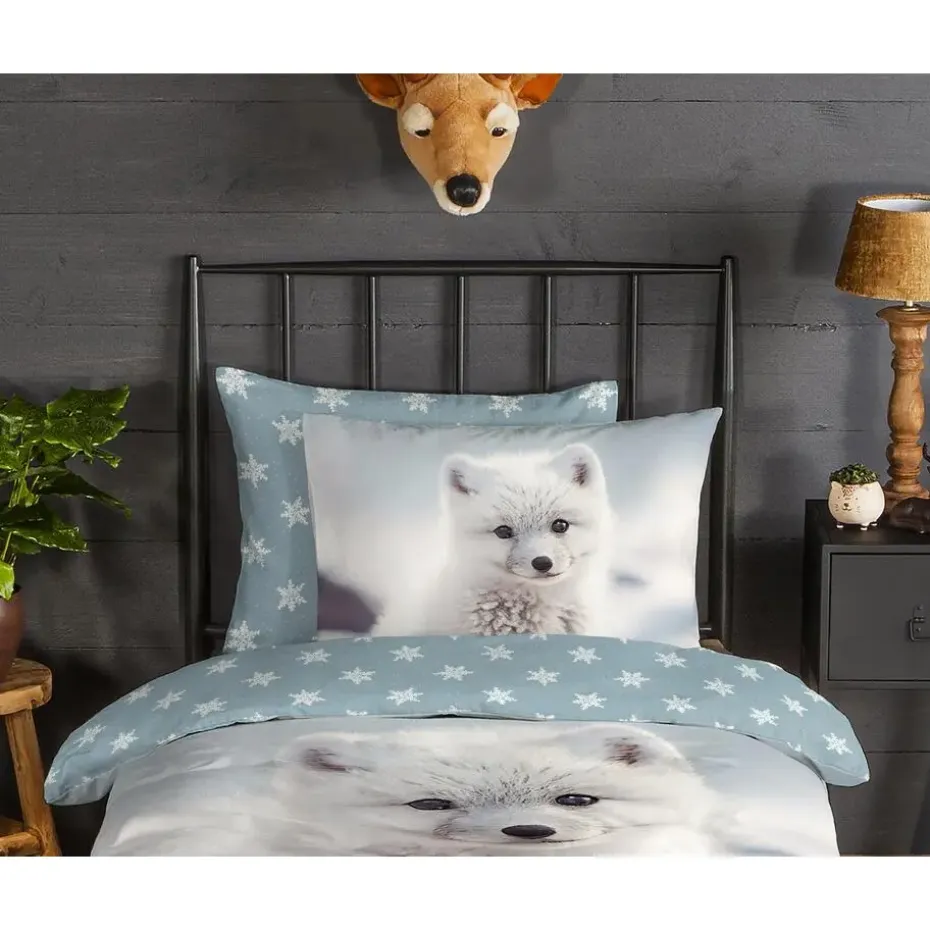 Flanellen kinderdekbedovertrek Toss van Good Morning, in de kleur wit, met een print van een baby poolvos. Het dekbedovertrek is gemaakt van 100% katoen/flanel dat licht is geruwd, waardoor een fluweeelzacht laagje ontstaat dat heerlijk warm aanvoelt -perfect voor koude nachten. Deze warme, comfortabele stof is ademend en vochtabsorberend. Dit leuke kinderdekbedovertrek is een toevoeging aan iedere kinderkamer. Flanellen kinderdekbedovertrek zijn bij uitstek geschikt voor de koude wintermaanden.