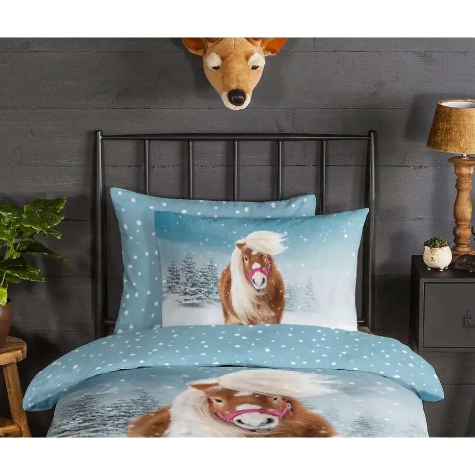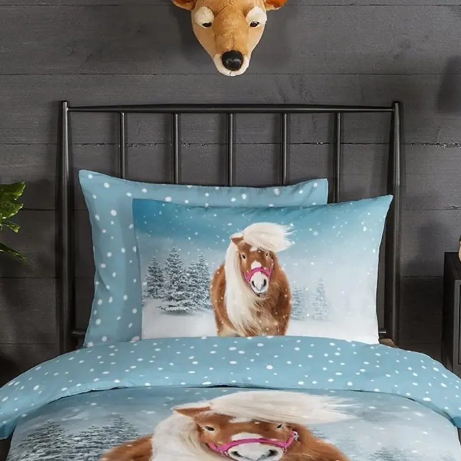 Flanellen kinderdekbedovertrek Sweet van Good Morning, in de kleur multi, met een print van een paard in de sneeuw. Het dekbedovertrek is gemaakt van 100% katoen/flanel dat licht is geruwd, waardoor een fluweeelzacht laagje ontstaat dat heerlijk warm aanvoelt -perfect voor koude nachten. Deze warme, comfortabele stof is ademend en vochtabsorberend. Dit leuke kinderdekbedovertrek is een toevoeging aan iedere kinderkamer. Flanellen kinderdekbedovertrek zijn bij uitstek geschikt voor de koude wintermaanden.