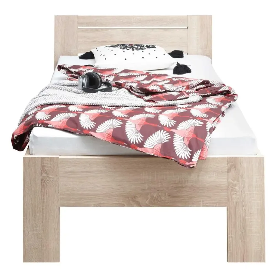 Dit eenpersoonsbed Sartre is inzetbaar in heel wat settings, zowel in de tiener-, logeer- als volwassenenkamer. Het bed is gemaakt uit spaanplaat in sonoma eikdecor en is zowel op het vlak van stijl als design gemakkelijk in elk slaapkamerinterieur te integreren. Het bed is geschikt voor een lattenbodem en matras van 90×200 en heeft een instaphoogte van ongeveer 46cm.