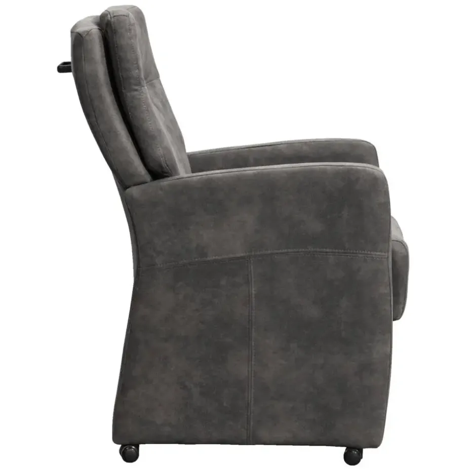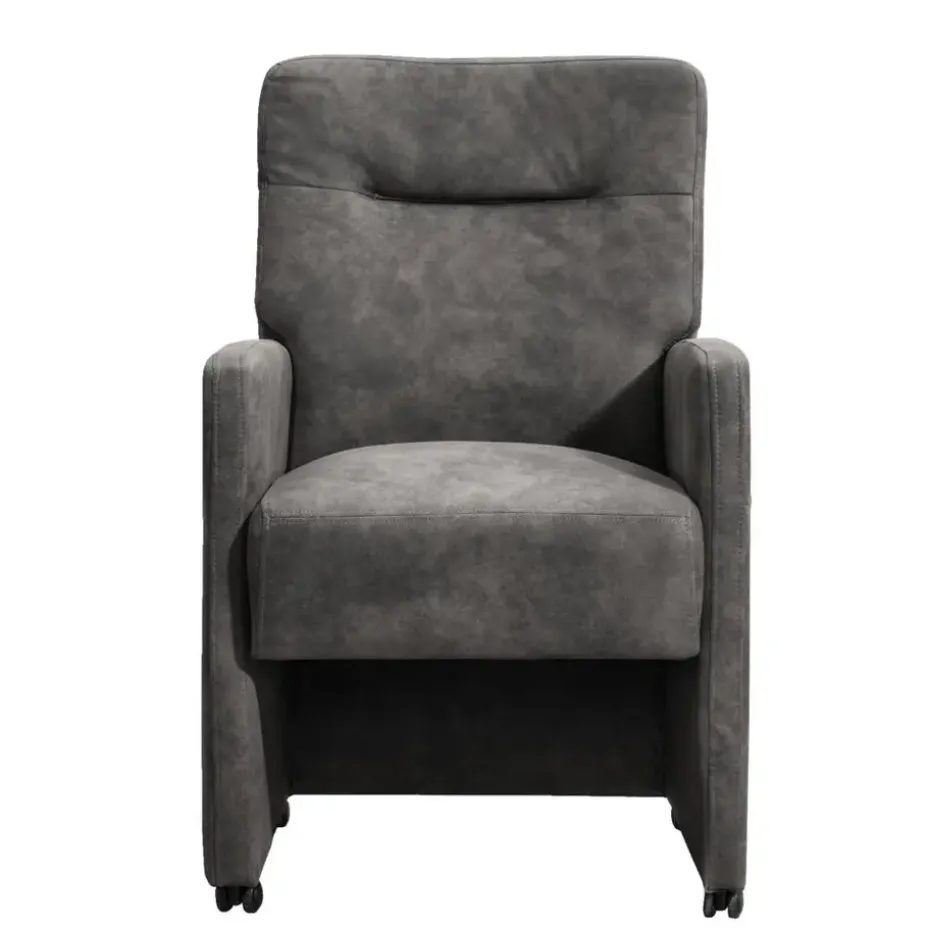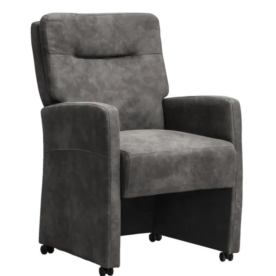 Eetkamerstoel Daniel is een stoere zeer comfortabele eetkamerfauteuil. Deze stoel is vervaardigd uit een antraciet kleurige preston stof. Preston is een zachte stof met een natuurlijk patroon dat lijkt op leder. De comfortabele zitting met armleuningen, de hoge rug en de handige wieltjes zorgen ervoor dat je avonden achter elkaar kan genieten van het (na)tafelen.