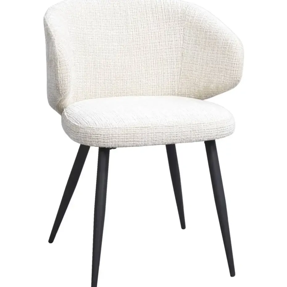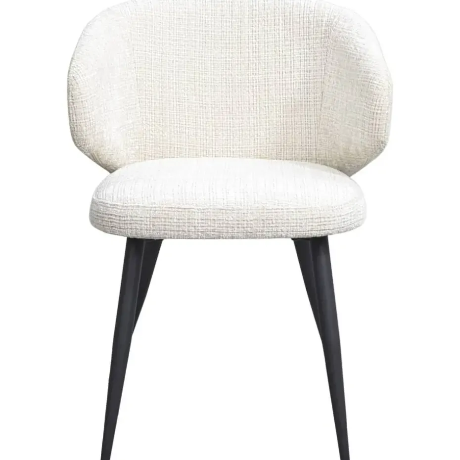 Eetkamerstoel Demi is trendy stoel, bekleed met een crèmekleurige stof. De bouclé achtige zitting in combinatie met het zwartkleurige, metalen onderstel maakt het tot de perfecte eetkamerstoel. Stoel Demi heeft een royale zitting met armleuningen, dit zorgt voor een optimaal zitcomfort.