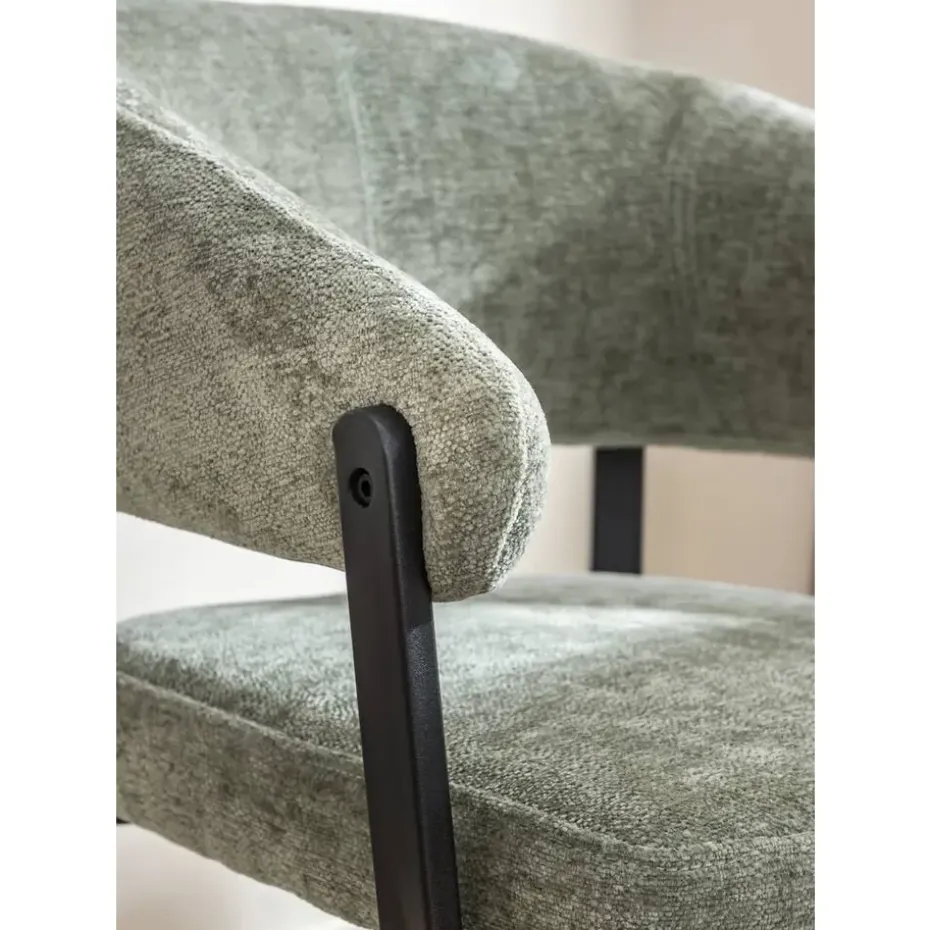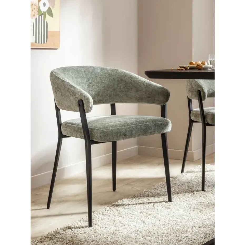 Wanneer je op zoek bent naar een moderne eetkamerstoel, dan is Eetkamerstoel Liv perfect voor jou. Met haar groene bekleding en zwarte metalen poten past deze stoel in ieder interieur. Liv heeft ronde vormen en een open rugleuning waardoor de stoel een frisse uitstaling krijgt. De metalen poten en zachte bekleding geven de stoel een trendy look en door de comfortabele armleuningen kun je uren tafelen. Makkelijk onder te tafel te schuiven en verkijgbaar in verschillende kleuren.