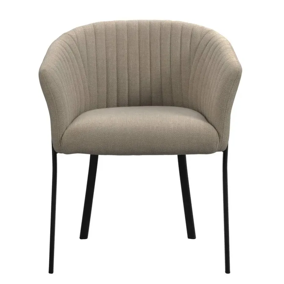 Eetkamerstoel Luigi is een tijdloze stoel die jouw eetkamer een unieke uitstraling geeft! De stof waarmee de zitting en rug- en armleuningen bekleed zijn is slijtvast en heeft een prachtige zand tint, waardoor hij in ieder interieur past. De metalen poten geven de stoel een trendy look en door de comfortabele armleuningen kun je uren tafelen. Ook verkrijgbaar in het groen.